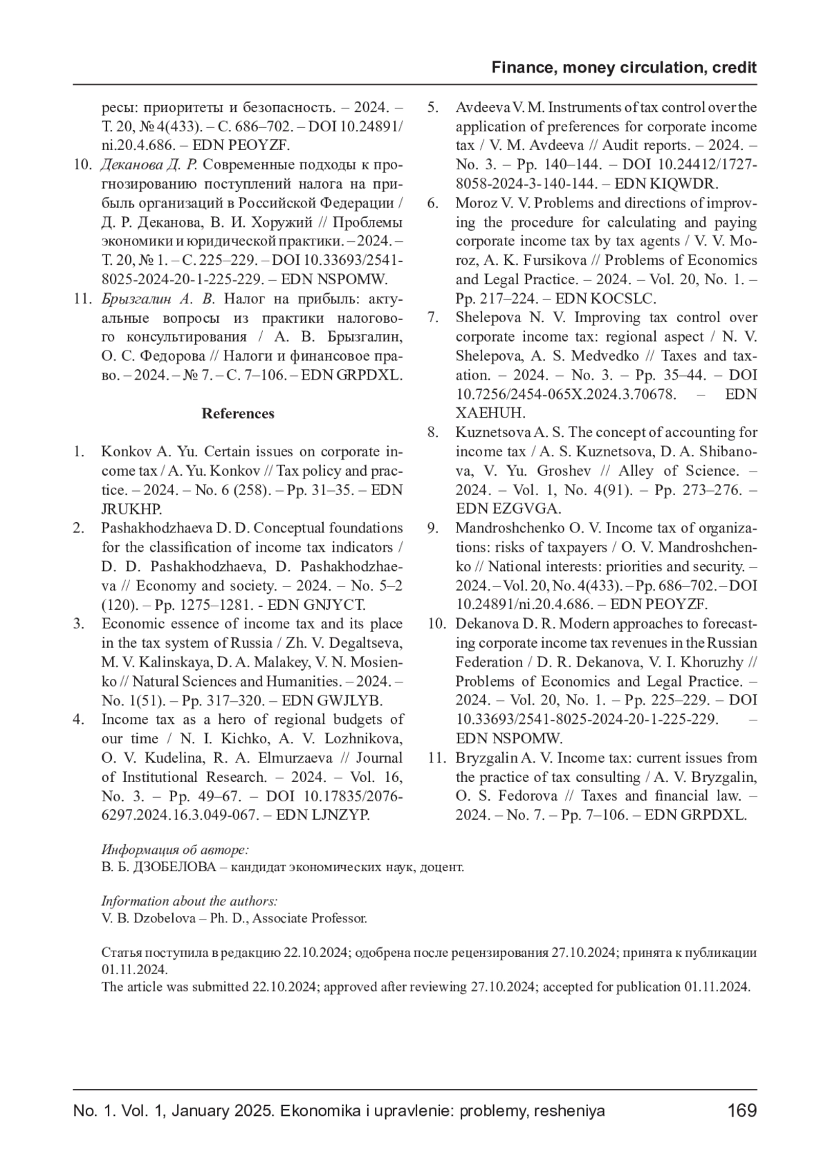 7. Шелепова Н. В. Совершенствование налогового контроля по налогу на прибыль организаций: региональный аспект / Н. В. Шелепова, А. С. Медведько // Налоги и налогообложение. - 2024. - № 3. - С. 35- 44. DOI: 10.7256/2454-065X.2024.3.70678 EDN: XAEHUH