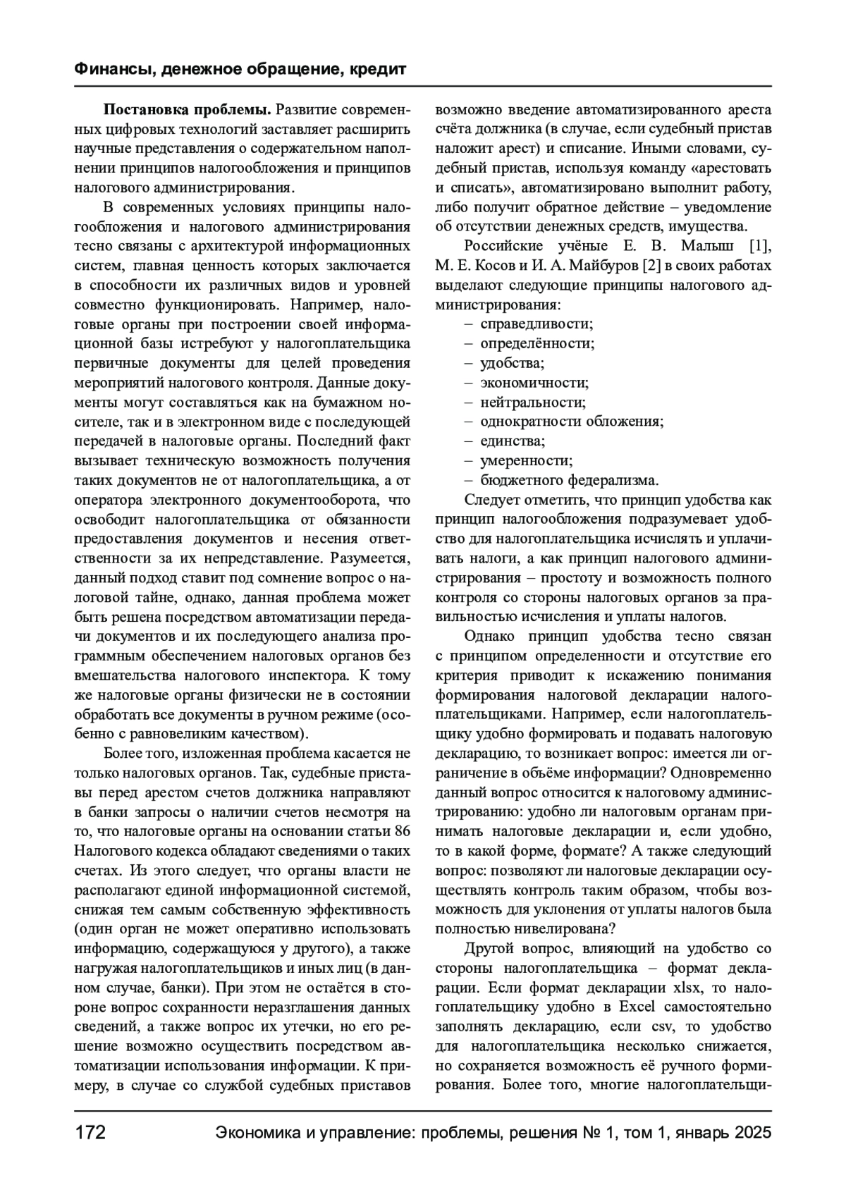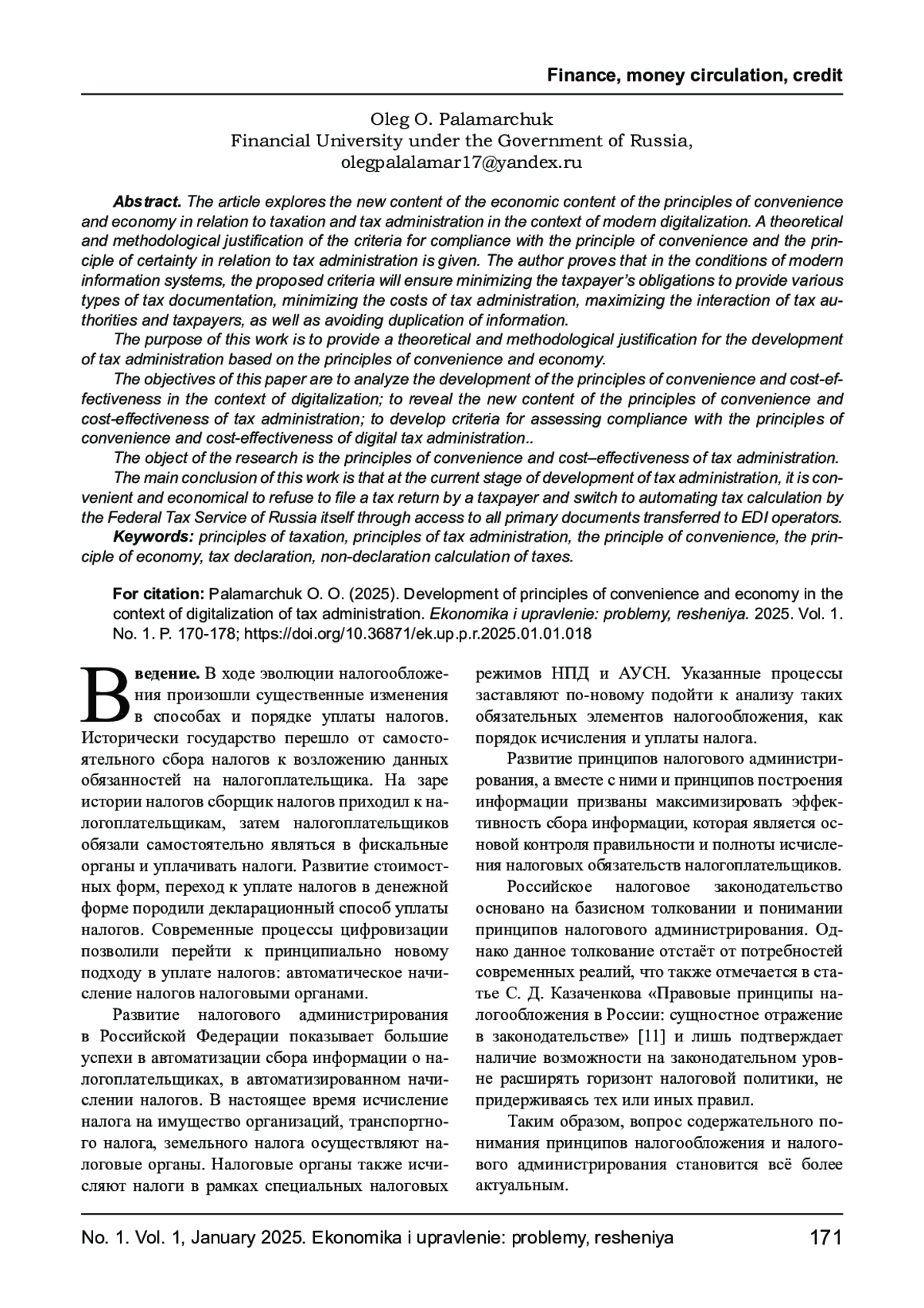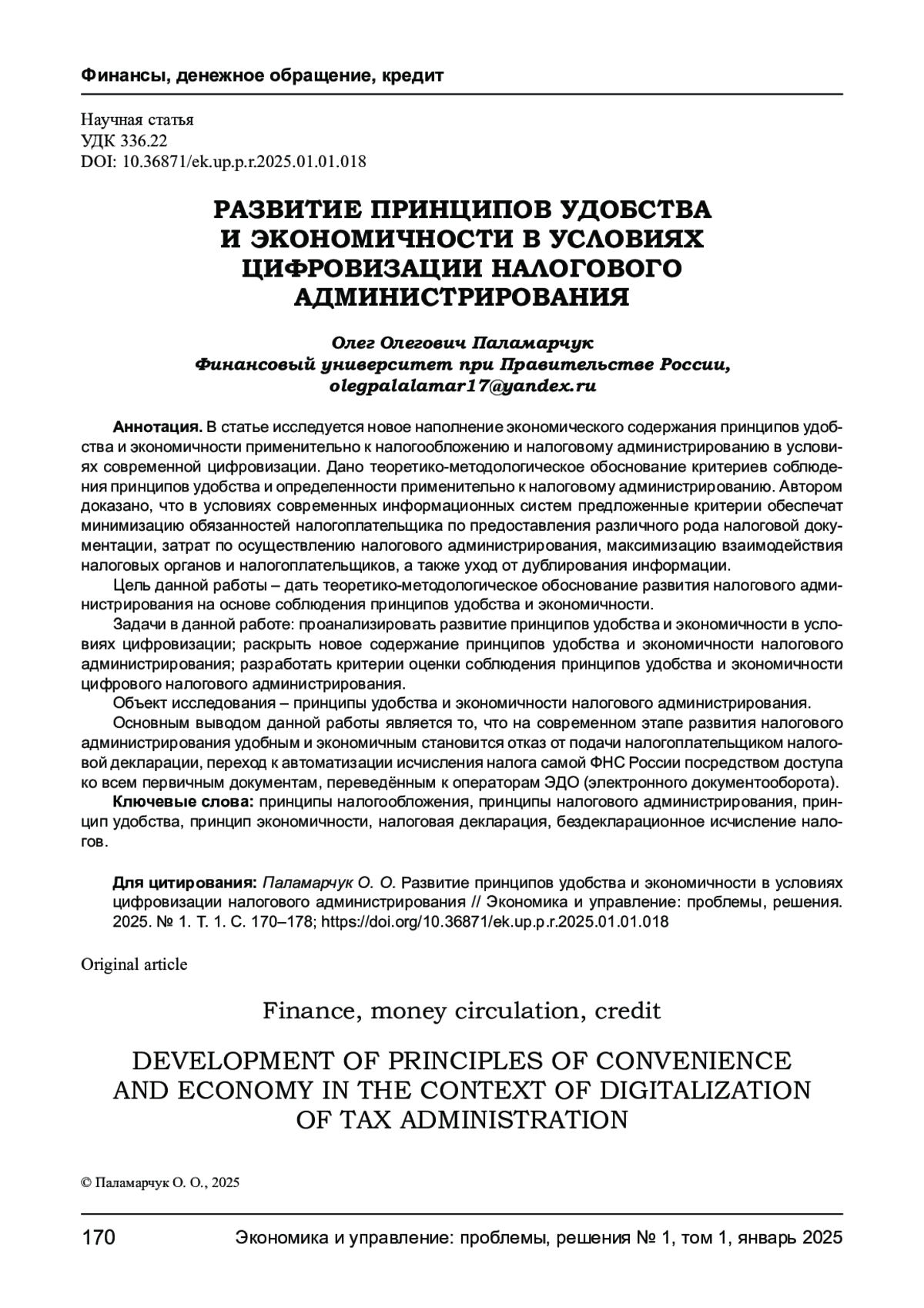 Объект исследования - принципы удобства и экономичности налогового администрирования. Основным выводом данной работы является то, что на современном этапе развития налогового администрирования удобным и экономичным становится отказ от подачи налогоплательщиком налоговой декларации, переход к автоматизации исчисления налога самой ФНС России посредством доступа ко всем первичным документам, переведённым к операторам ЭДО (электронного документооборота).