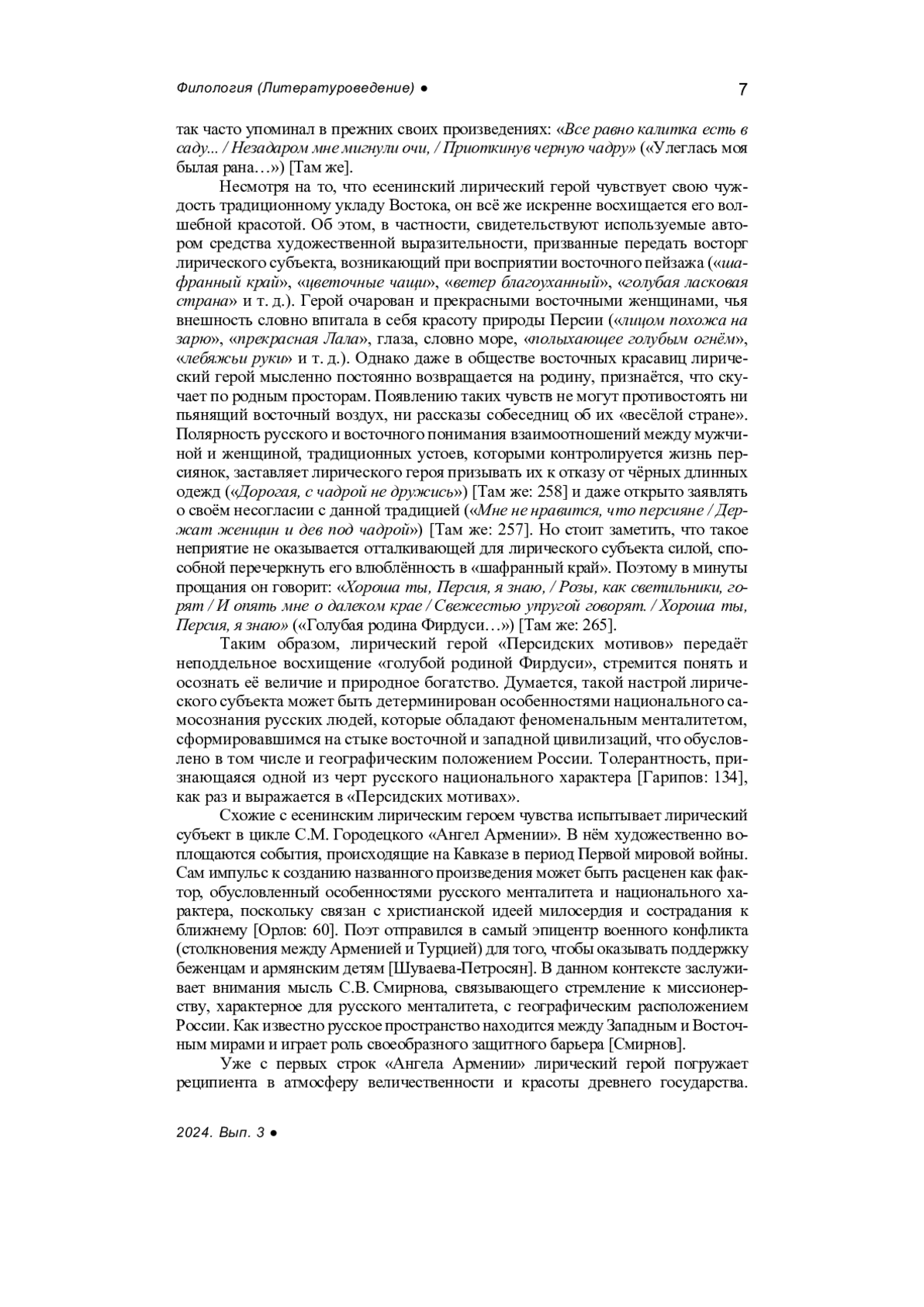 6. Исахан И. Тема Востока в творчестве Сергея Есенина: на материале цикла “Персидские мотивы” // Современная наука: актуальные проблемы теории и практики. Серия: Гуманитарные науки. 2018. № 4. С. 124-127. EDN: XSCEQX