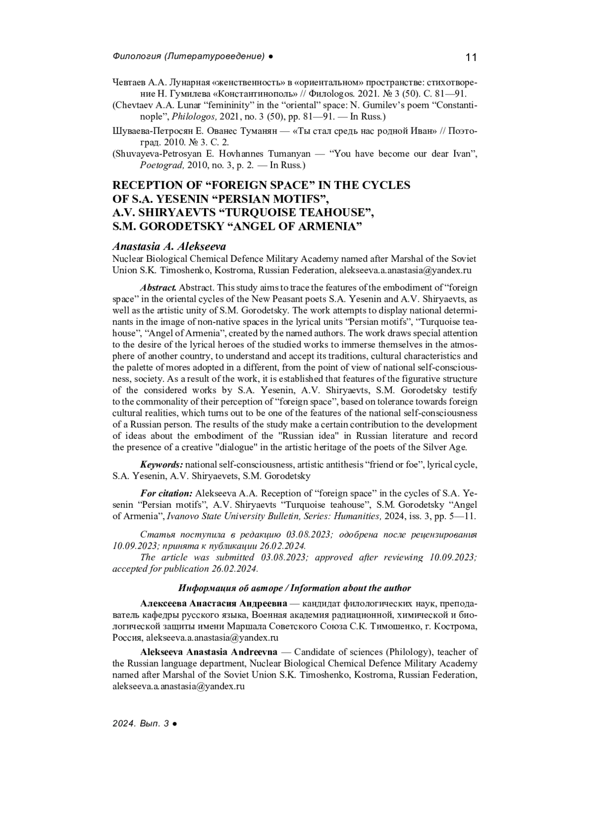 Настоящее исследование имеет своей целью проследить особенности воплощения «чужого пространства» в ориентальных циклах поэтов-новокрестьян С. А. Есенина и А. В. Ширяевца, а также в художественном единстве С. М. Городецкого. В работе предпринимается попытка отобразить национальные детерминанты в изображении неродных просторов в лирических единствах «Персидские мотивы», «Бирюзовая чайхана», «Ангел Армении», созданных названными авторами. В работе обращается особое внимание на стремление лирических героев исследуемых произведений погрузиться в атмосферу другого государства, понять и принять его традиции, особенности культуры и палитру нравов, принятых в ином, с точки зрения национального самосознания, обществе. В результате работы устанавливается, что особенности образного строя рассматриваемых произведений С. А. Есенина, А. В. Ширяевца, С. М. Городецкого свидетельствуют об общности восприятия ими «чужого пространства», основанного на толерантности по отношению к инокультурным реалиям, что оказывается одной из черт национального самосознания русского человека. Итоги исследования фиксируют наличие творческого диалога в художественном наследии поэтов Серебряного века