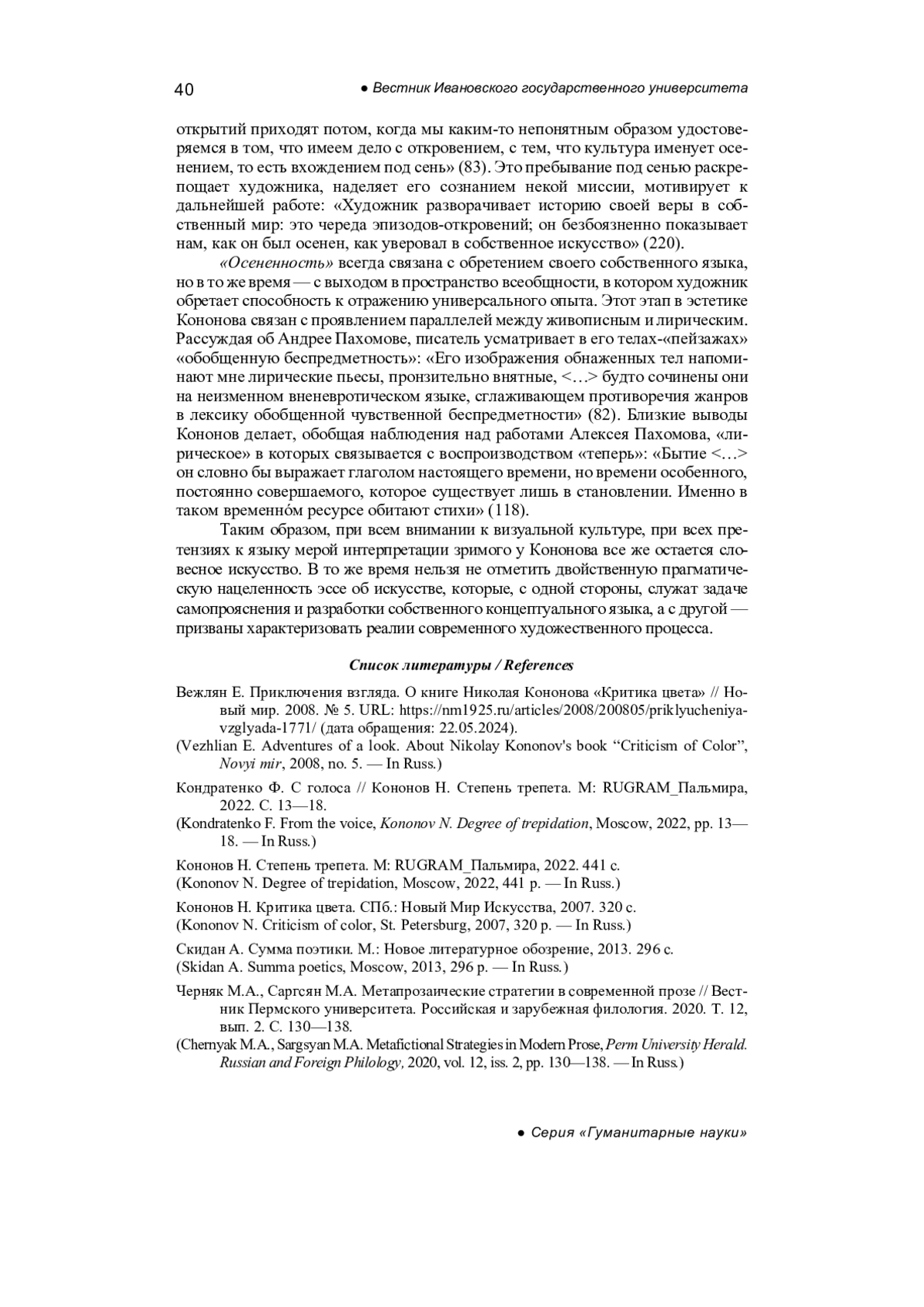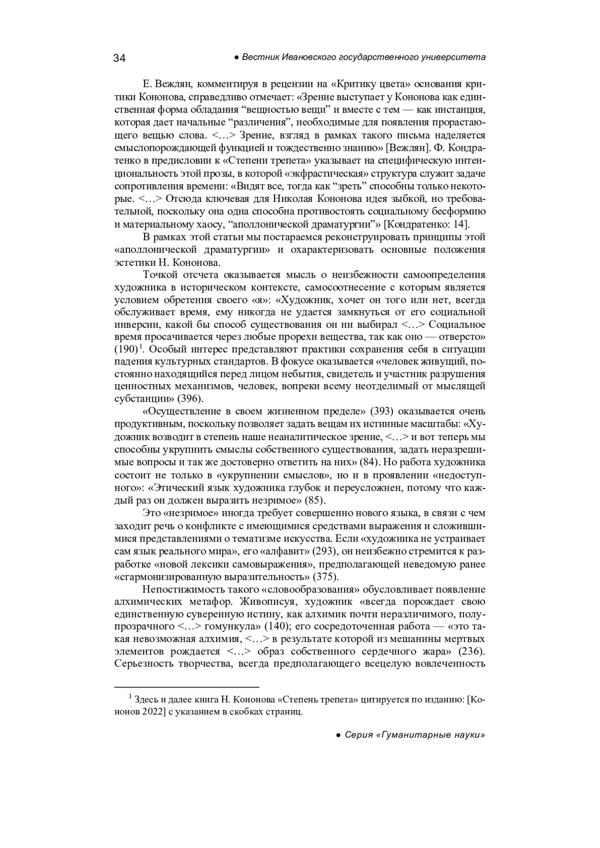 ЖИТЕНЕВ А. А., СКРЯБИНА А. В. ЭСТЕТИКА НИКОЛАЯ КОНОНОВА // ВЕСТНИК ИВАНОВСКОГО ГОСУДАРСТВЕННОГО УНИВЕРСИТЕТА. СЕРИЯ: ГУМАНИТАРНЫЕ НАУКИ. 2024. № 3