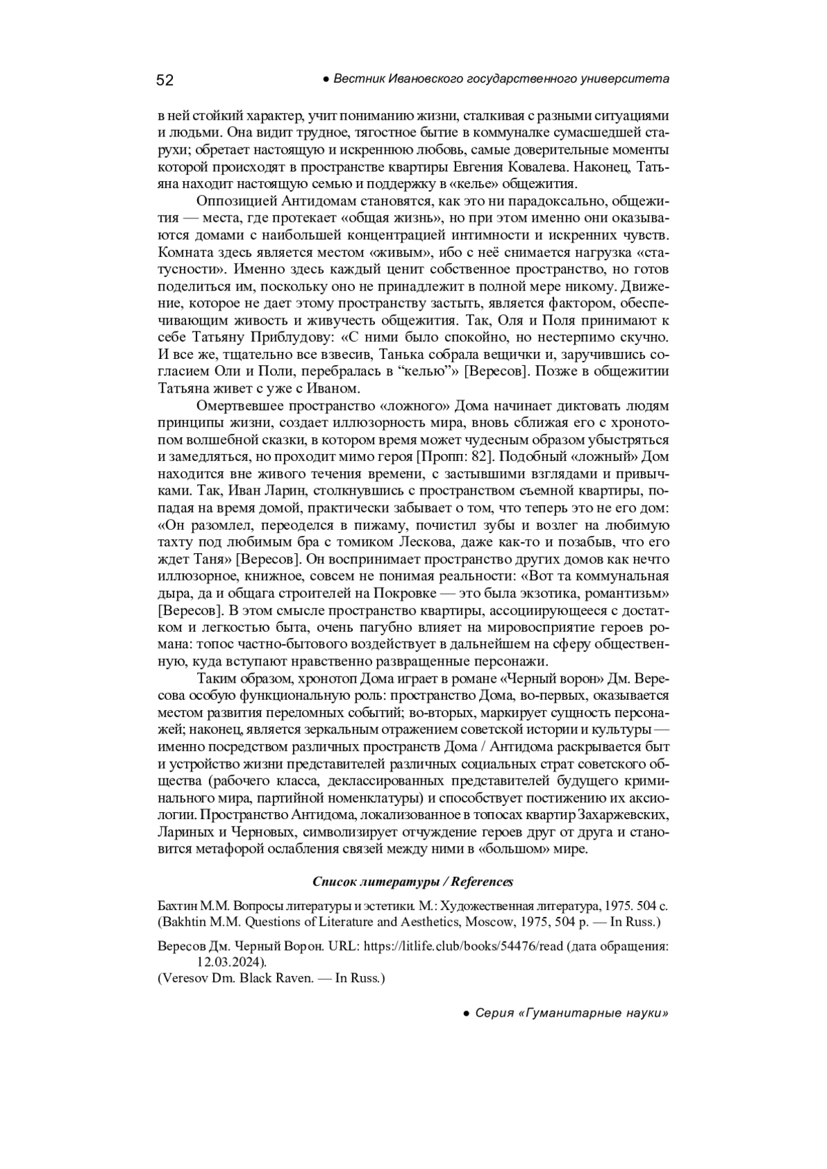 Цель статьи — выявить ключевые особенности хронотопа Дома в романе «Черный ворон» современного петербургского прозаика Дм. Вересова. Были использованы следующие методы исследования: сравнительно-исторический, типологический, метод целостного анализа художественного произведения. В результате было установлено, что хронотоп Дома играет в «Черном вороне» особую функциональную роль: пространство Дома, во-первых, оказывается здесь местом развития переломных событий, в сравнении с другими романами саги, действие которых не будет локализовано и ограничено исключительно Ленинградом и несколькими квартирами. Во-вторых, маркирует сущность персонажей; наконец, является зеркальным отражением советской истории и культуры — именно посредством различных пространств Дома / Антидома раскрывается быт и устройство жизни представителей различных социальных страт советского общества (рабочего класса, деклассированных представителей будущего криминального мира, партийной номенклатуры) и способствует постижению их аксиологии. Художественное пространство и время играют в тексте сюжетообразующую роль. Именно в первом романе семейной саги о судьбах двух сестер Дом как пространственная составляющая является не только фоном развертывания мистических и детективных коллизий, но и смысловым центром, катализатором сюжетного развертывания. В «Чёрном вороне» во временном отношении происходит совмещение далекого и близкого (время личных судеб вписано в историческое), в пространственном — малого (дом) и большого (Ленинград, Россия) хронотопов.
