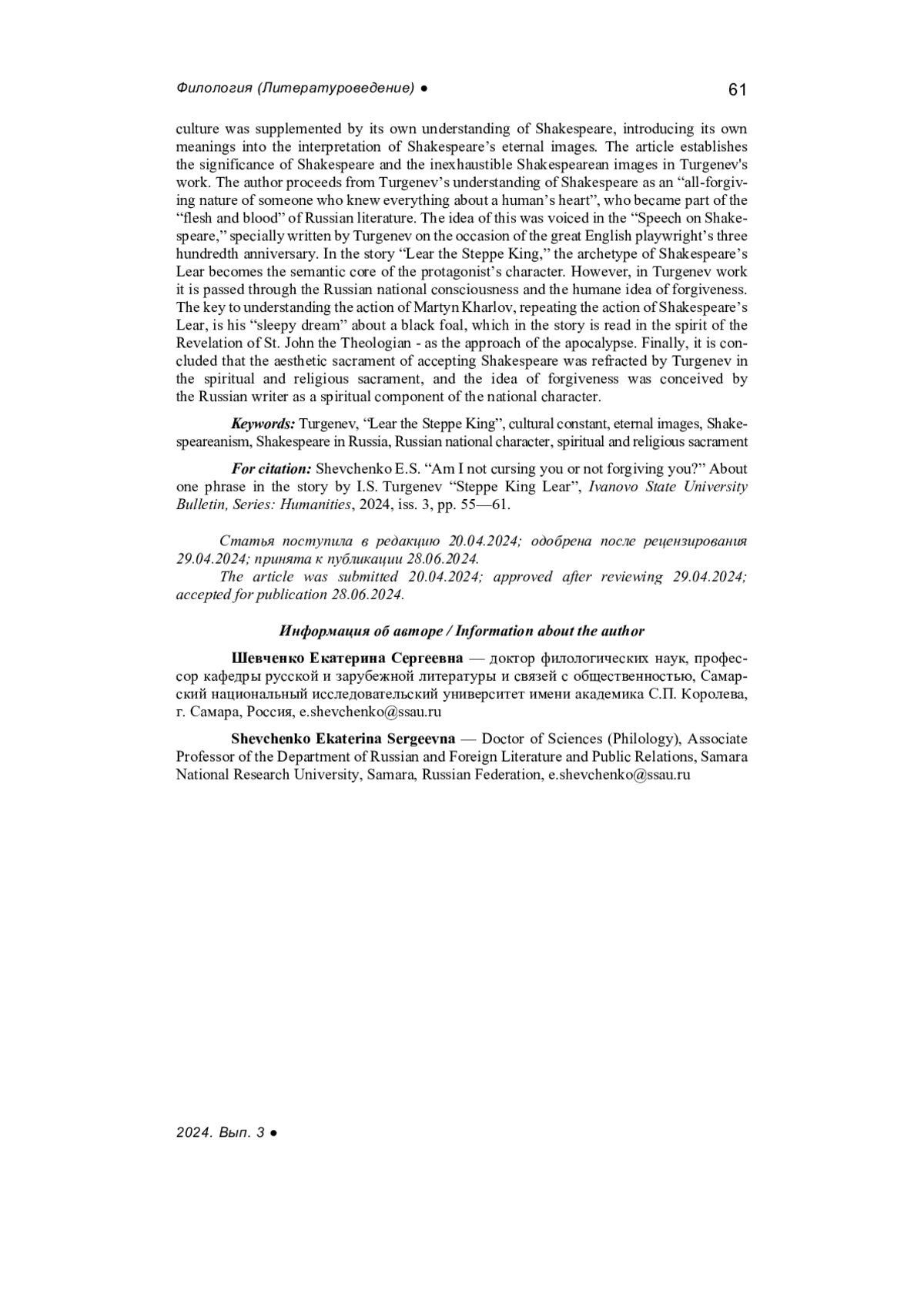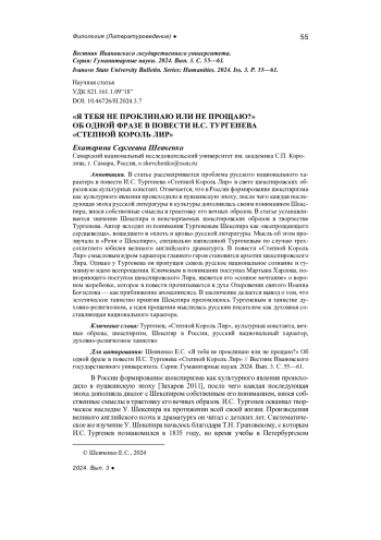В статье рассматривается проблема русского национального характера в повести И. С. Тургенева «Степной Король Лир» в свете шекспировских образов как культурных констант. Отмечается, что в России формирование шекспиризма как культурного явления происходило в пушкинскую эпоху, после чего каждая последующая эпоха русской литературы и культуры дополнялась своим пониманием Шекспира, внося собственные смыслы в трактовку его вечных образов. В статье устанавливается значение Шекспира и неисчерпаемых шекспировских образов в творчестве Тургенева. Автор исходит из понимания Тургеневым Шекспира как «всепрощающего сердцеведца», вошедшего в «плоть и кровь» русской литературы. Мысль об этом прозвучала в «Речи о Шекспире», специально написанной Тургеневым по случаю трехсотлетнего юбилея великого английского драматурга. В повести «Степной Король Лир» смысловым ядром характера главного героя становится архетип шекспировского Лира. Однако у Тургенева он пропущен сквозь русское национальное сознание и гуманную идею всепрощения. Ключевым в понимании поступка Мартына Харлова, повторяющего поступок шекспировского Лира, является его «сонное мечтание» о вороном жеребенке, которое в повести прочитывается в духе Откровения святого Иоанна Богослова — как приближение апокалипсиса. В заключение делается вывод о том, что эстетическое таинство приятия Шекспира преломлялось Тургеневым в таинстве духовно-религиозном, а идея прощения мыслилась русским писателем как духовная составляющая национального характера.