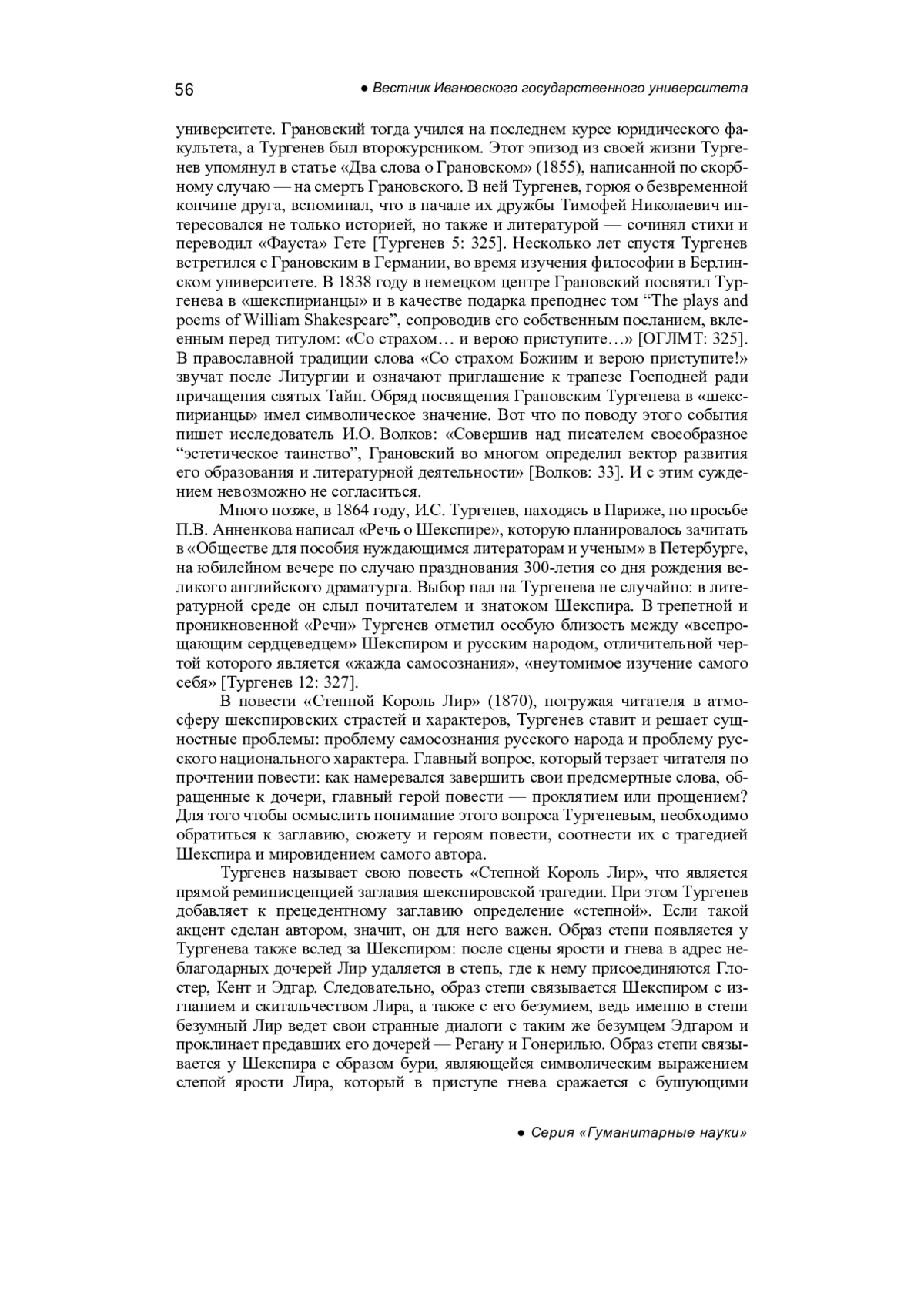 4. Вигерина Л.И. Своеобразие художественного времени в повести И.С. Тургенева “Степной Король Лир”: к проблеме символического подтекста // Пушкинские чтения - 2012: “Живые” традиции в литературе: жанр, автор, герой, текст. СПб., 2012. С. 30-43. EDN: SIOHJD