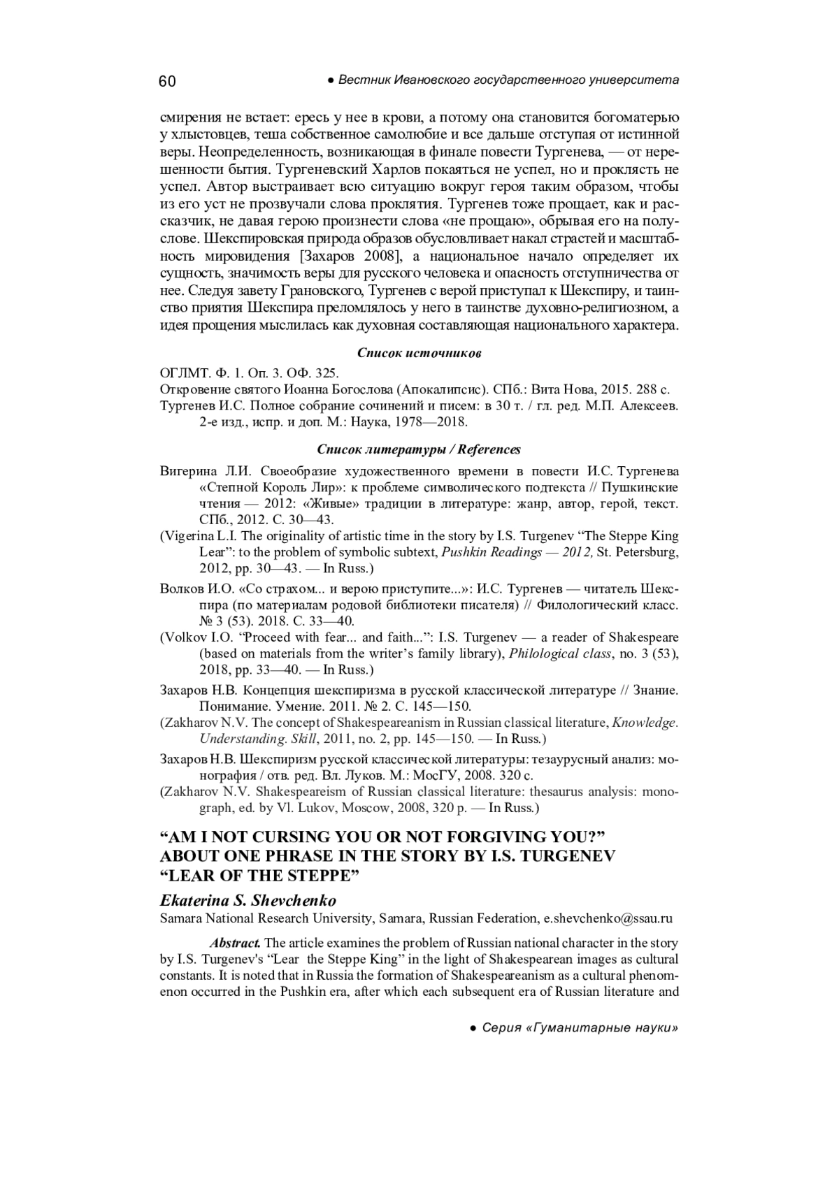 Volkov I.O. “Proceed with fear.. and faith.”.: I.S. Turgenev - a reader of Shakespeare (based on materials from the writer’s family library), Philological class, no. 3 (53), 2018, pp. 33-40. - In Russ. EDN: YMRALR