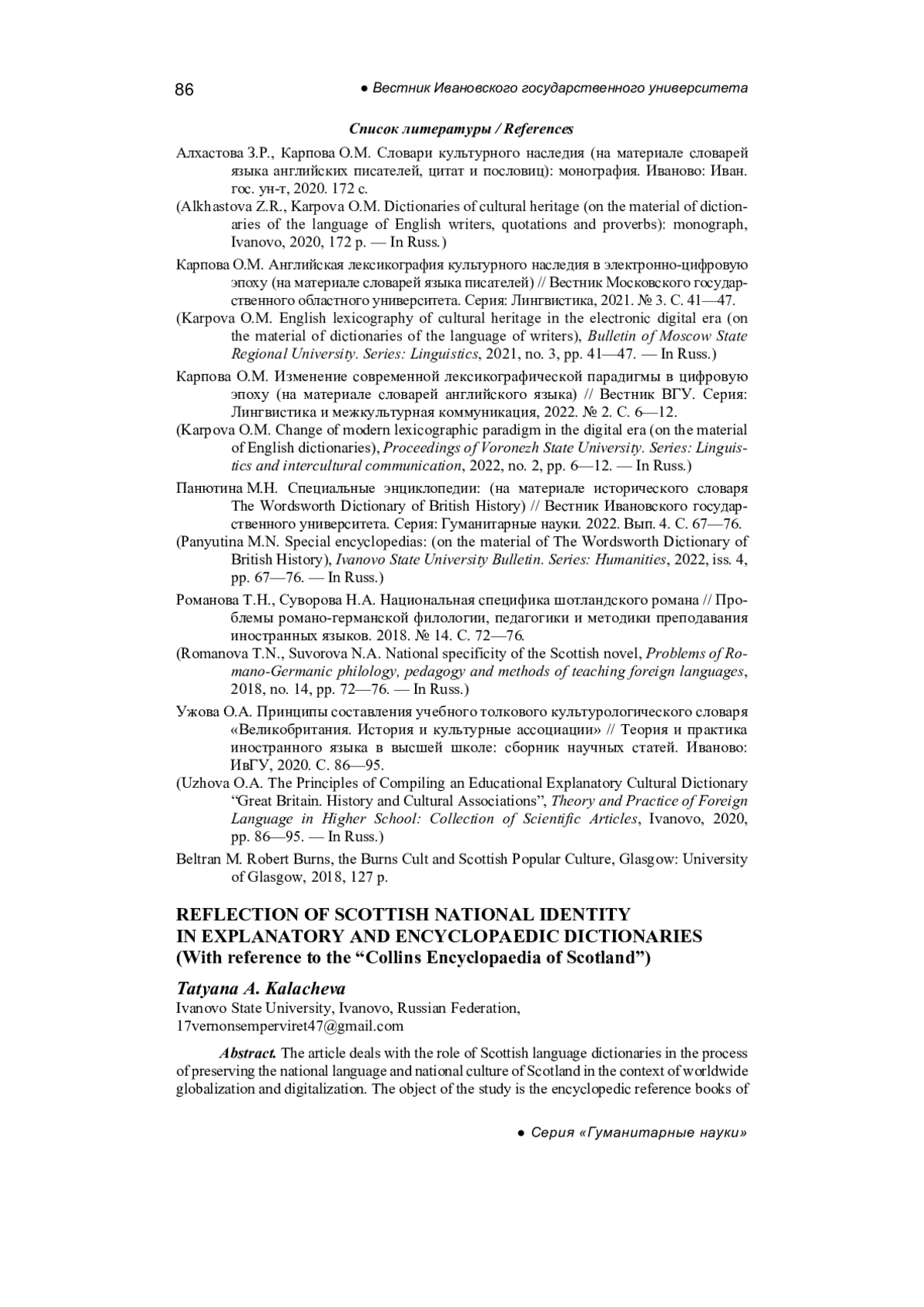 5. Романова Т.Н., Суворова Н.А. Национальная специфика шотландского романа // Проблемы романо-германской филологии, педагогики и методики преподавания иностранных языков. 2018. № 14. С. 72-76. EDN: LWVRWD
