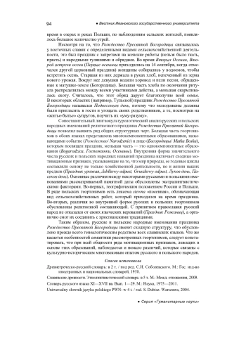 5. Суворова Н.В. Русские и польские именования христианского праздника Благовещение Пресвятой Богородицы (Лингвокультурологический аспект) // Вестник Ивановского государственного университета. Серия: Гуманитарные науки. 2022. Вып. 2. С. 73-81. - In Russ.). EDN: FVGLUW