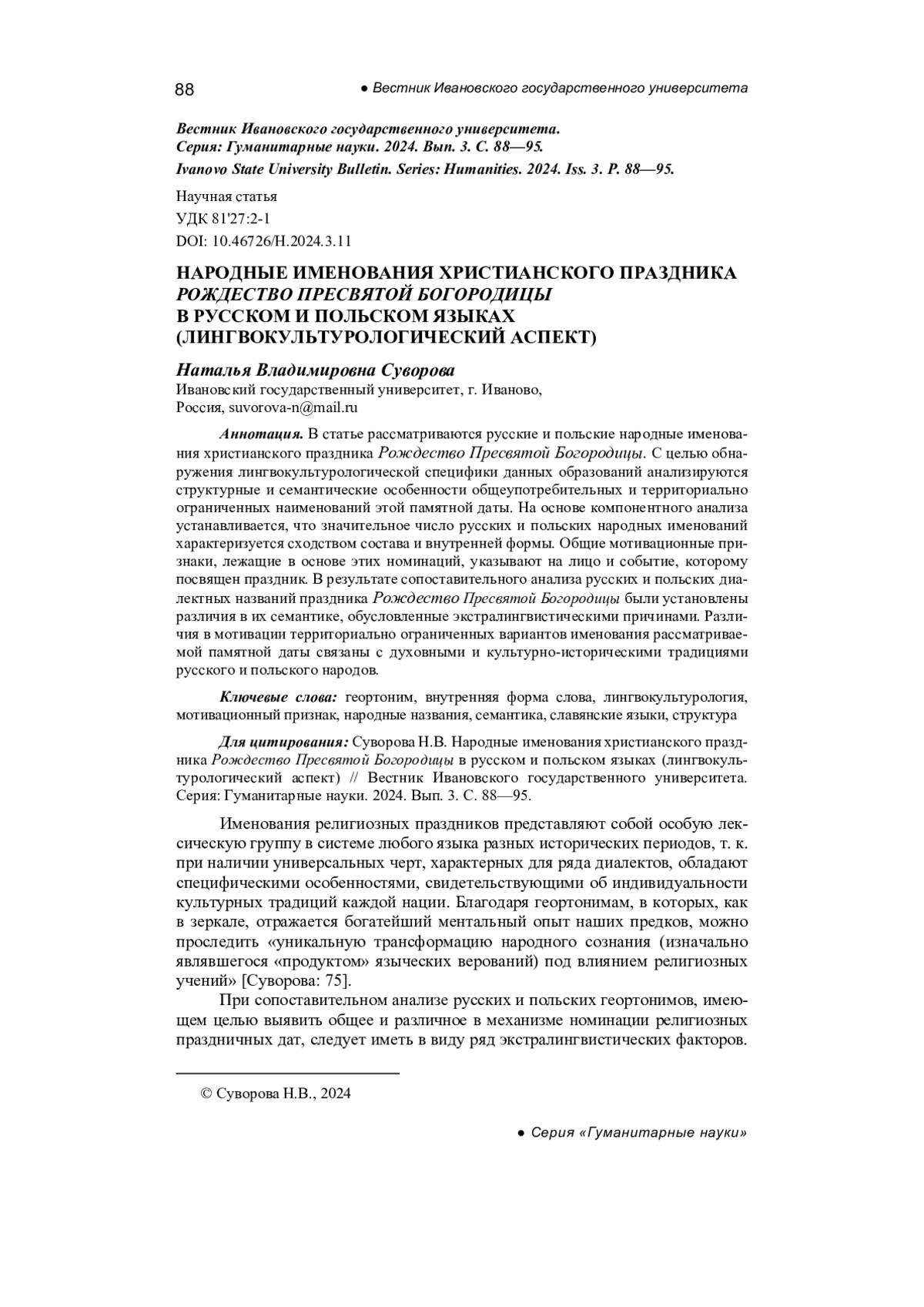 Suvorova N.V.Russian and Polish Names of the Christian holiday of the Annunciation of the Blessed Virgin Mary (Linguoculturological aspect), Ivanovo State University Bulletin, Series: Humanities, 2022, iss. 2, pp. 73-81. - In Russ.