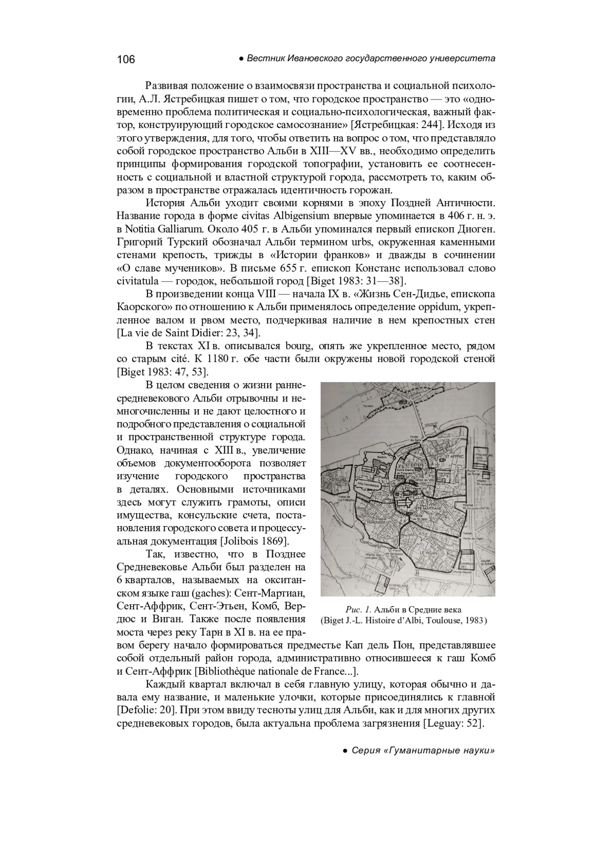 Статья посвящена изучению городского пространства позднесредневекового Альби в топографическом, архитектурном, политическом, экономическом и символическом измерениях. Предпринимается попытка рассмотрения городского пространства с позиций исторической психологии. На сегодняшний день данный подход, предполагающий изучение психологических феноменов применительно к городу и пространству, является одним из наиболее актуальных направлений современной исторической урбанистики. В особенности в этом отношении можно отметить увеличение интереса среди исследователей к средневековой истории. Таким образом, выбранная методология определяет научную новизну исследования. Целью работы является установление связи между физическим и символическим пространством, между горожанами и местом их обитания, а также изучение взаимовлияния пространства и социальной психологии. Устанавливается круг исторических источников, который включает в себя архитектурные, письменные, сфрагистические, геральдические и картографические типы, представленные как опубликованными, так и неопубликованными архивными материалами, а также сохранившими объектами монументальной архитектуры Позднего Средневековья, расположенными на территории города. Определяются возможности для изучения идентичности горожан в их связи с пространством на уровне индивида, института, квартала и городского сообщества как единого целого