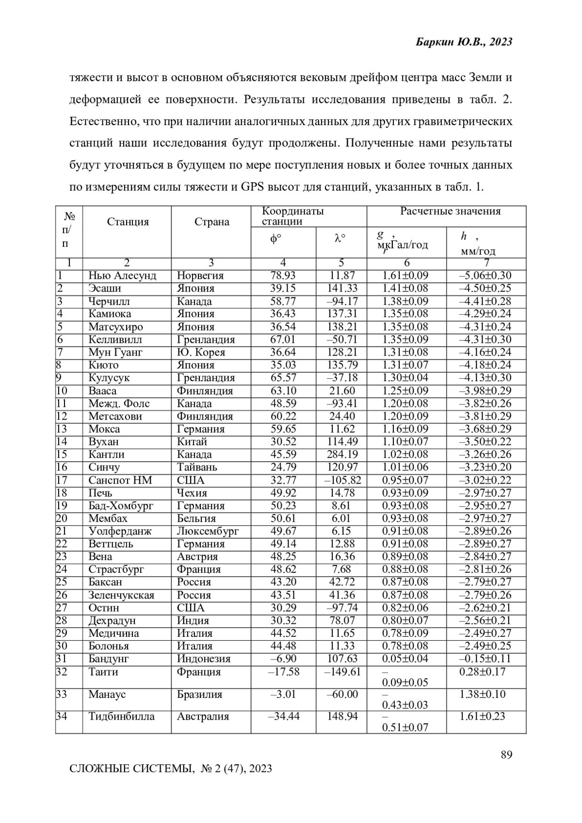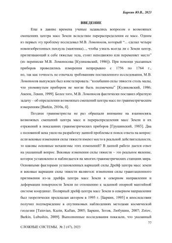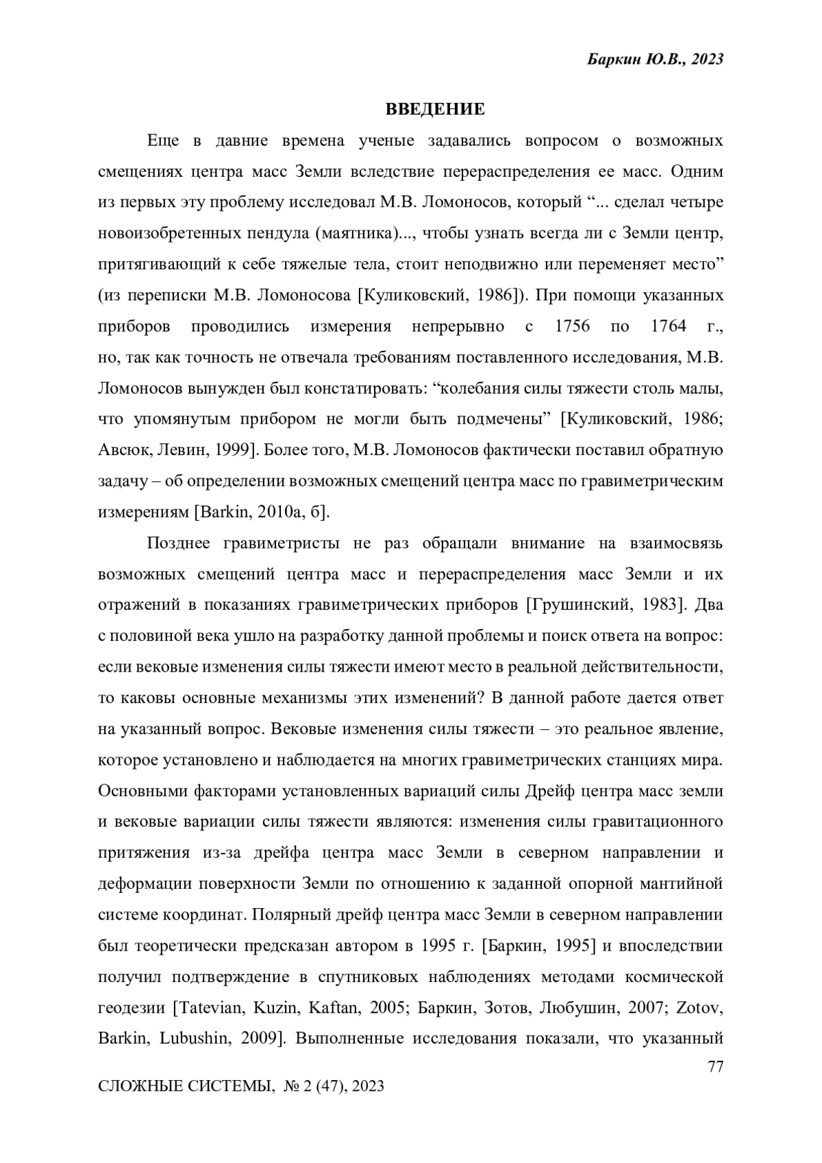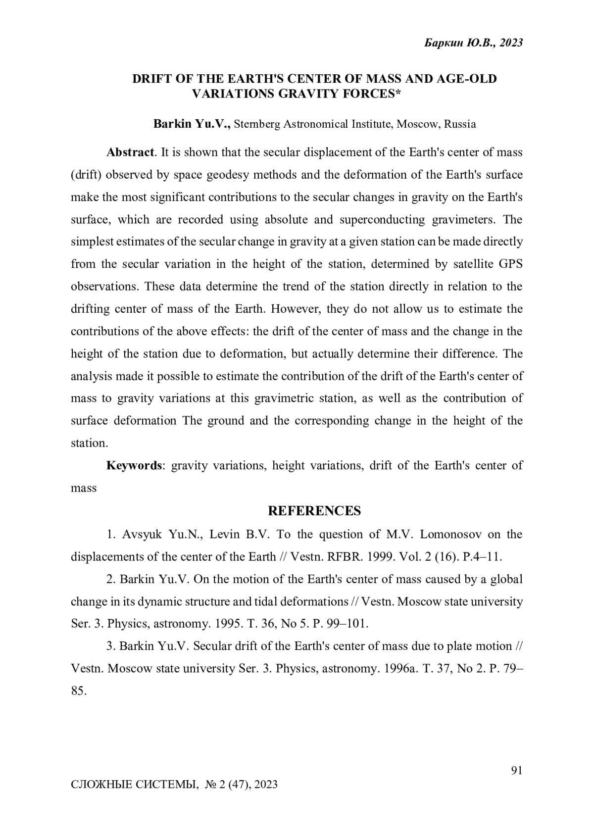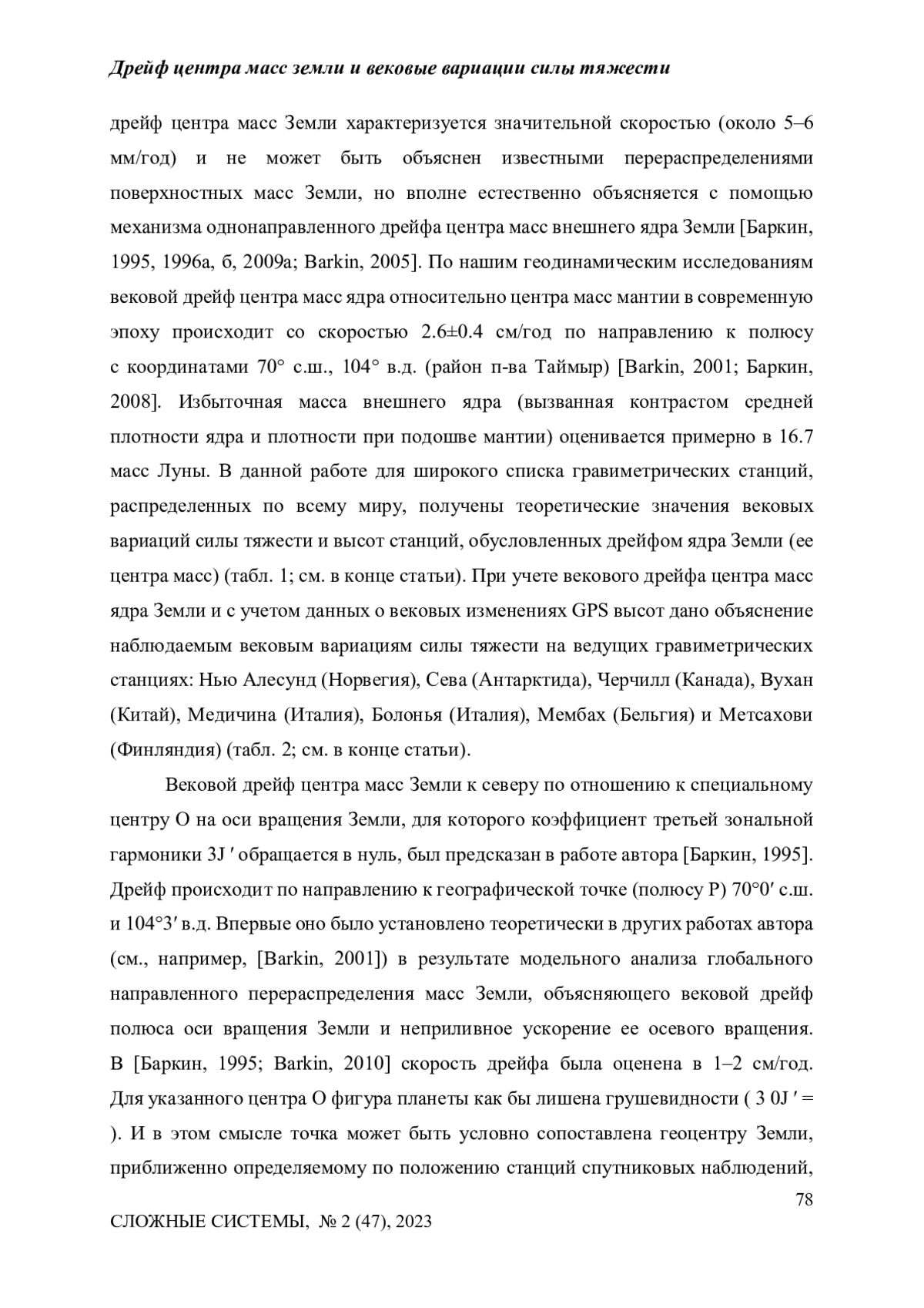 БАРКИН Ю. В. ДРЕЙФ ЦЕНТРА МАСС ЗЕМЛИ И ВЕКОВЫЕ ВАРИАЦИИ СИЛЫ ТЯЖЕСТИ // СЛОЖНЫЕ СИСТЕМЫ. 2023. № 2 (47)