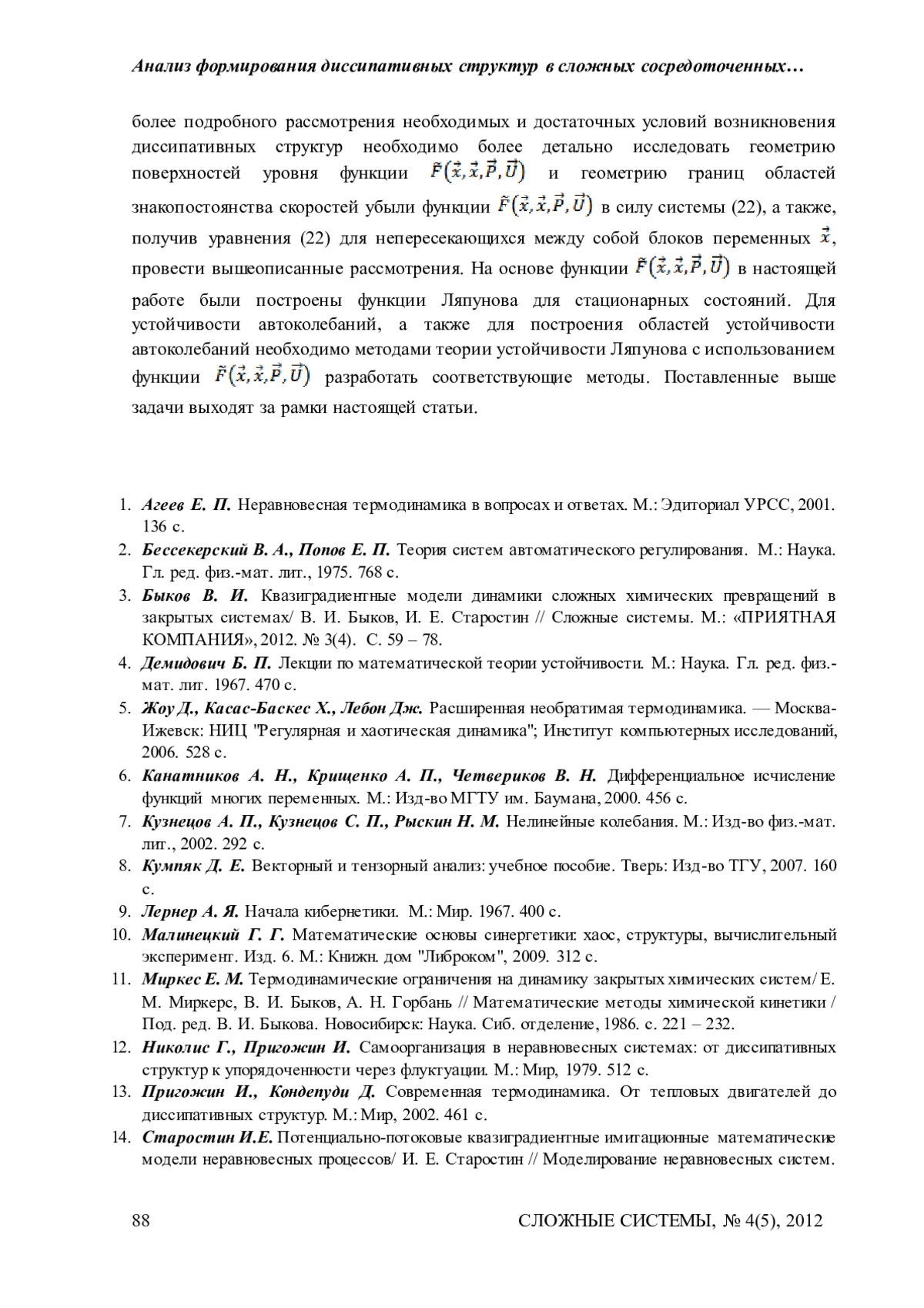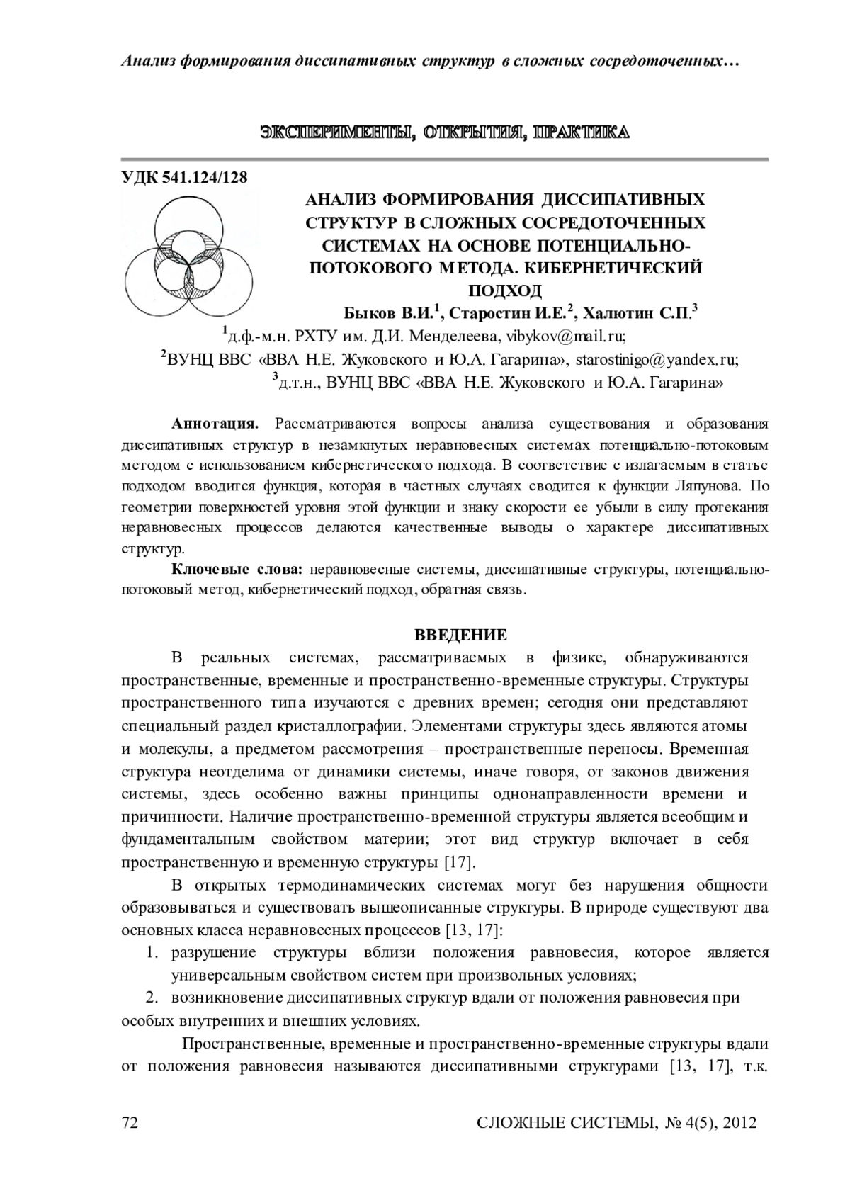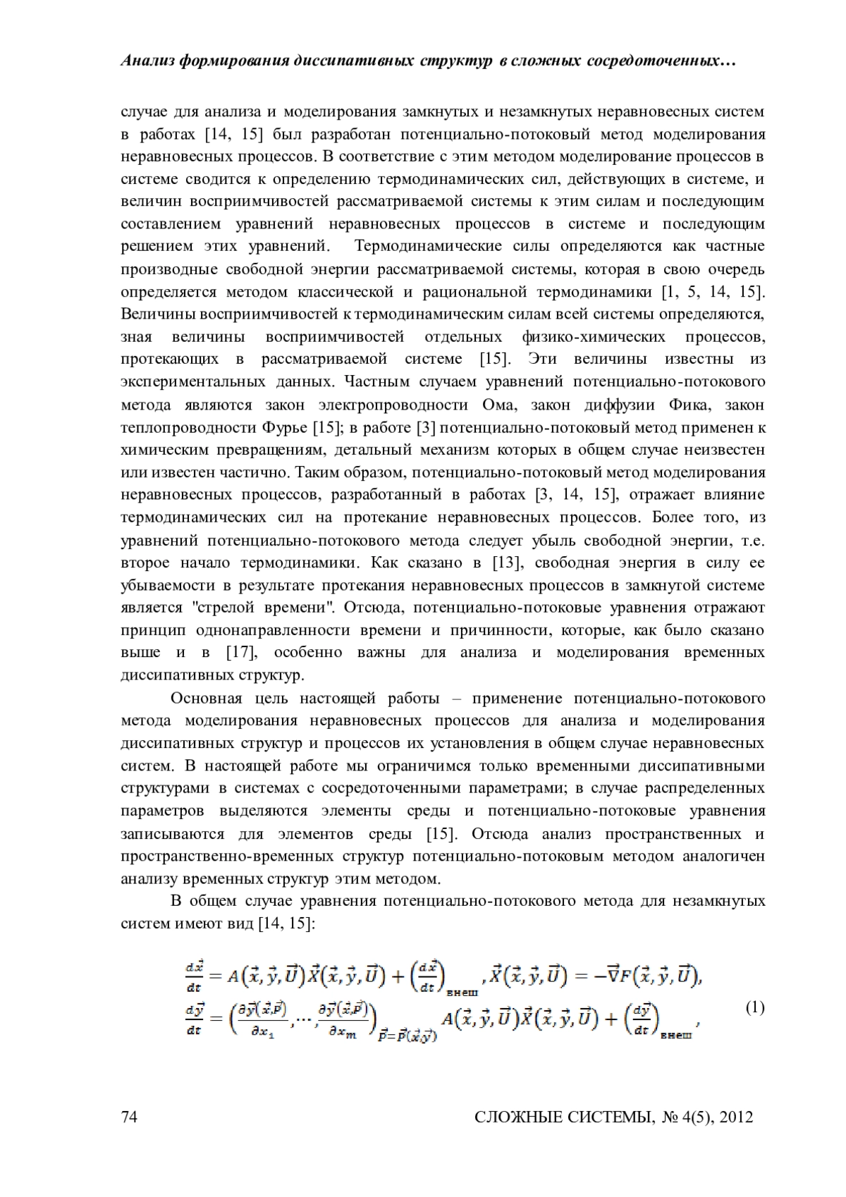 Статья: АНАЛИЗ ФОРМИРОВАНИЯ ДИССИПАТИВНЫХ СТРУКТУР В СЛОЖНЫХ СОСРЕДОТОЧЕННЫХ СИСТЕМАХ НА ОСНОВЕ ПОТЕНЦИАЛЬНОПОТОКОВОГО МЕТОДА. КИБЕРНЕТИЧЕСКИЙ ПОДХОД (2012)
