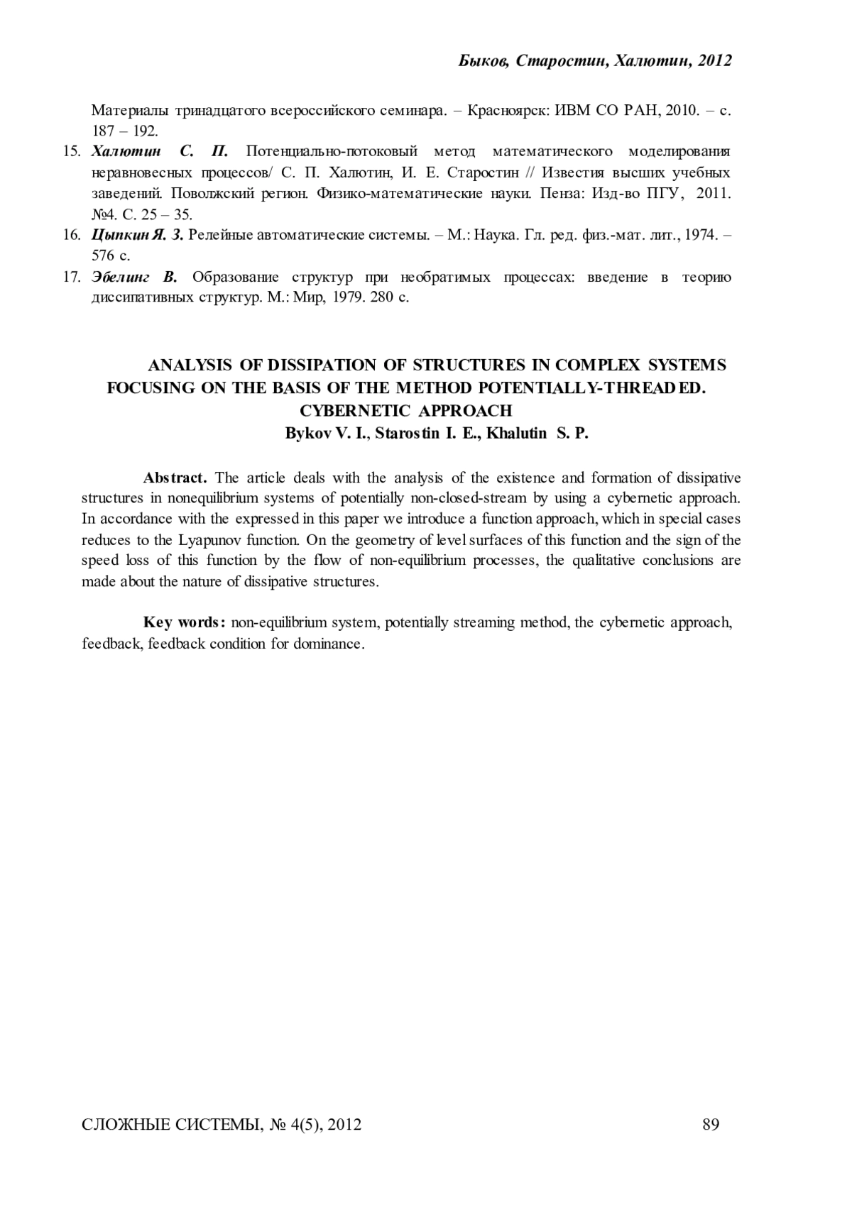 Ключевые фразы: еравновесные системы, диссипативные структуры, потенциально- потоковый метод, кибернетический подход, обратная связь