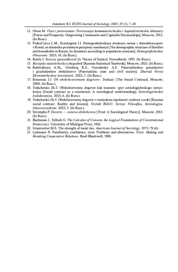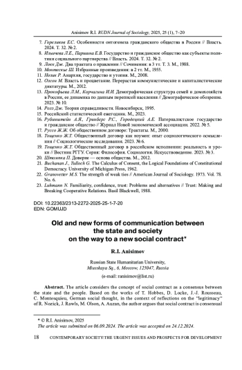 19. Тощенко Ж.Т. Общественный договор в российском исполнении: реальность и уроки // Вестник РГГУ. Серия: Философия. Социология. Искусствоведение. 2023. № 3. EDN: QMUUBE