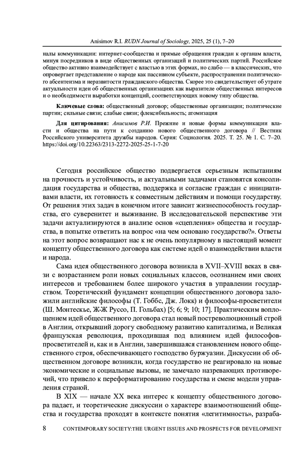 Статья представляет собой рецензию на книгу Ж. Т. Тощенко «Судьбы общественного договора в России: эволюция идей и уроки реализации» (М.: ФНИСЦ РАН; РГГУ, 2025. 844 с.). В монографии описано возникновение и проанализировано содержание концепции общественного договора, впервые выдвинутой и обоснованной мыслителями эпохи Просвещения как идеи социального контракта между народом и государством, причем латентного характера. Значительное внимание в книге уделено сложившимся теориям общественного договора и их особенностям, многообразным вариантам его толкования и осуществления в современной социальной практике. Особый акцент автор делает на выявлении основных характеристик общественного договора, его смысловой сущности как единства целей участников, ориентированных на взаимное доверие, баланс интересов и постоянное использование обратной связи. Представлены современные интерпретации общественного договора и новые варианты осмысления практик его реализации в современной общественно-политической жизни. Проведен обстоятельный анализ исторического опыта реализации общественного договора на разных этапах существования России/СССР в противоречивом развитии и функционировании страны, а также форм участия основных социальных групп в общественном договоре. Обозначены суть, содержание и эволюция идей общественного договора в XX-XXI веках, их трансформация и уроки реализации общественного договора на различных этапах общественного развития.