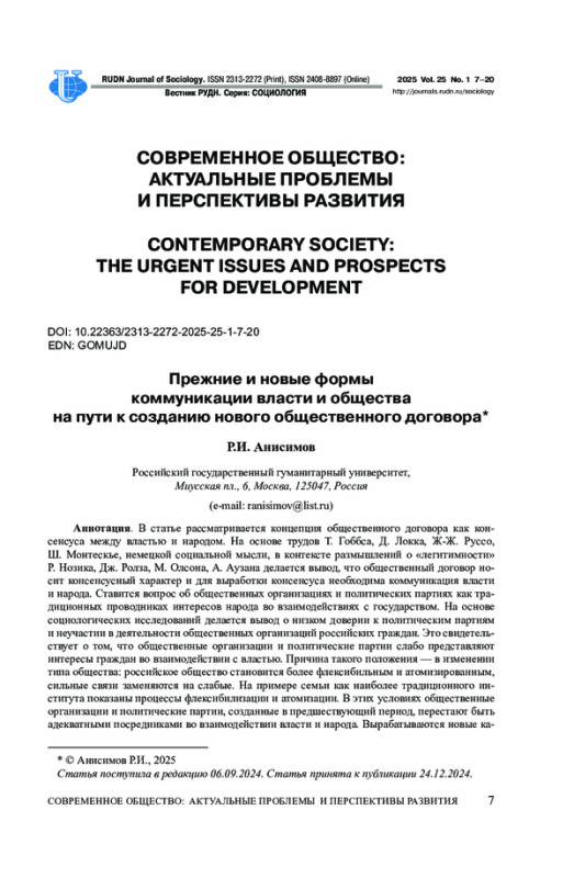 В статье рассматривается концепция общественного договора как консенсуса между властью и народом. На основе трудов Т. Гоббса, Д. Локка, Ж-Ж. Руссо, Ш. Монтескье, немецкой социальной мысли, в контексте размышлений о «легитимности» Р. Нозика, Дж. Ролза, М. Олсона, А. Аузана делается вывод, что общественный договор носит консенсусный характер и для выработки консенсуса необходима коммуникация власти и народа. Cтавится вопрос об общественных организациях и политических партиях как традиционных проводниках интересов народа во взаимодействиях с государством. На основе социологических исследований делается вывод о низком доверии к политическим партиям и неучастии в деятельности общественных организаций российских граждан. Это свидетельствует о том, что общественные организации и политические партии слабо представляют интересы граждан во взаимодействии с властью. Причина такого положения - в изменении типа общества: российское общество становится более флексибильным и атомизированным, сильные связи заменяются на слабые. На примере семьи как наиболее традиционного института показаны процессы флексибилизации и атомизации. В этих условиях общественные организации и политические партии, созданные в предшествующий период, перестают быть адекватными посредниками во взаимодействии власти и народа. Вырабатываются новые каналы коммуникации: интернет-сообщества и прямые обращения граждан к органам власти, минуя посредников в виде общественных организаций и политических партий. Российское общество активно взаимодействует с властью в этих формах, но слабо - в классических, что опровергает представление о народе как пассивном субъекте, распространении политического абсентеизма и неразвитости гражданского общества. Скорее это свидетельствует об утрате актуальности идеи об общественных организациях как выразителе общественных интересов и о необходимости выработки концепций, соответствующих новому типу общества.