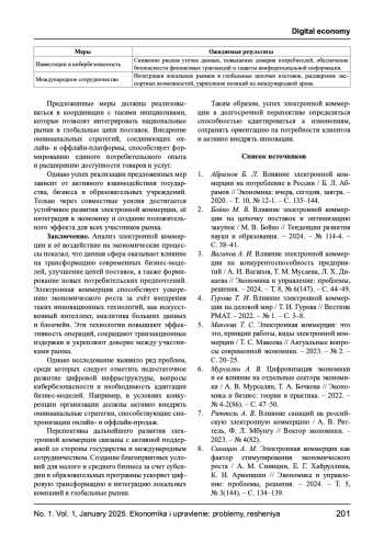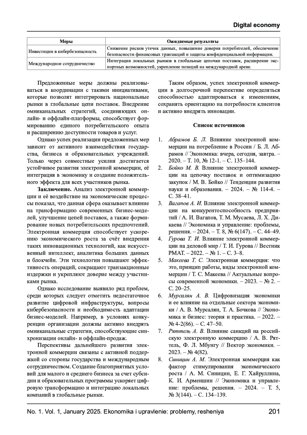 1. Абрамов Б. Л. Влияние электронной коммерции на потребление в России / Б. Л. Абрамов // Экономика: вчера, сегодня, завтра. - 2020. - Т. 10, № 12-1. - С. 135-144. EDN: ZNCHKP