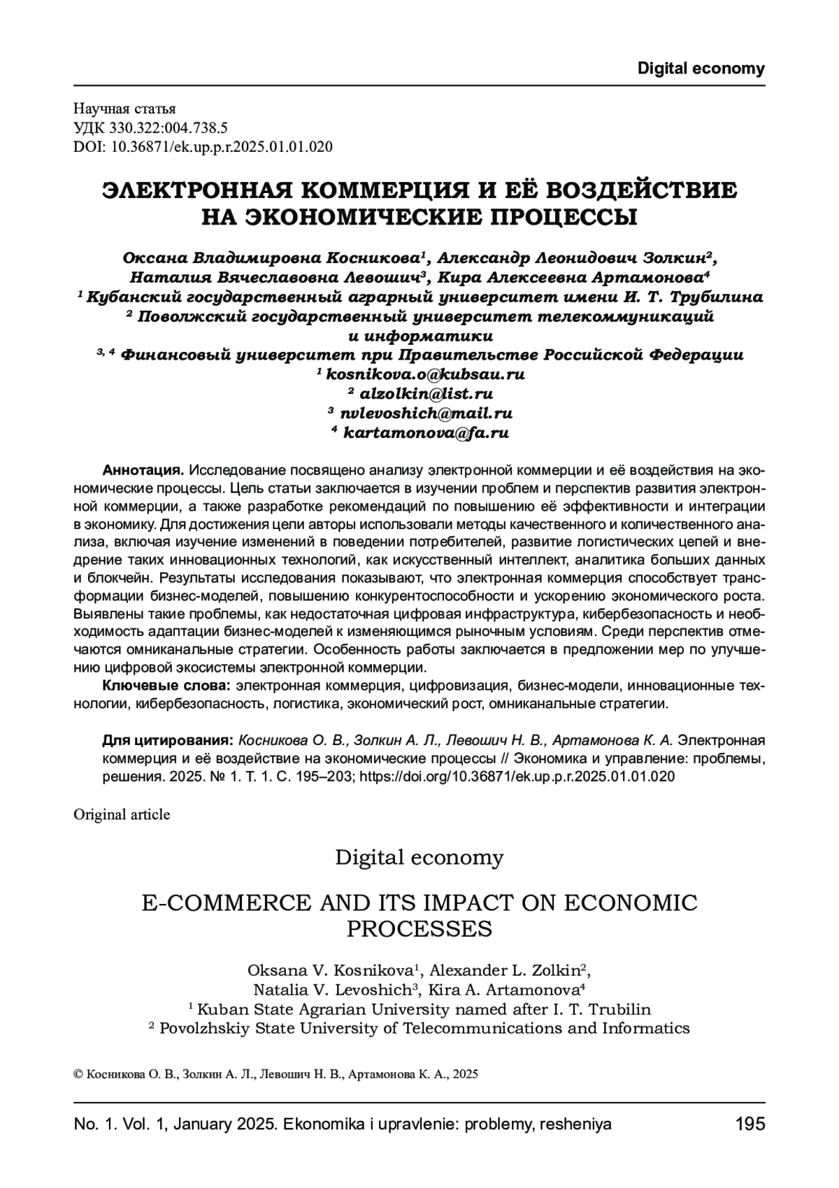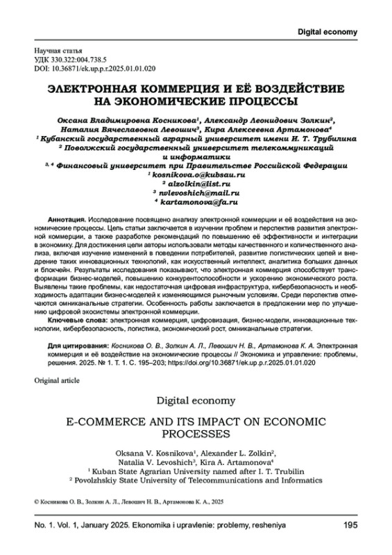 Исследование посвящено анализу электронной коммерции и её воздействия на экономические процессы. Цель статьи заключается в изучении проблем и перспектив развития электронной коммерции, а также разработке рекомендаций по повышению её эффективности и интеграции в экономику. Для достижения цели авторы использовали методы качественного и количественного анализа, включая изучение изменений в поведении потребителей, развитие логистических цепей и внедрение таких инновационных технологий, как искусственный интеллект, аналитика больших данных и блокчейн. Результаты исследования показывают, что электронная коммерция способствует трансформации бизнес-моделей, повышению конкурентоспособности и ускорению экономического роста. Выявлены такие проблемы, как недостаточная цифровая инфраструктура, кибербезопасность и необходимость адаптации бизнес-моделей к изменяющимся рыночным условиям. Среди перспектив отмечаются омниканальные стратегии. Особенность работы заключается в предложении мер по улучшению цифровой экосистемы электронной коммерции.