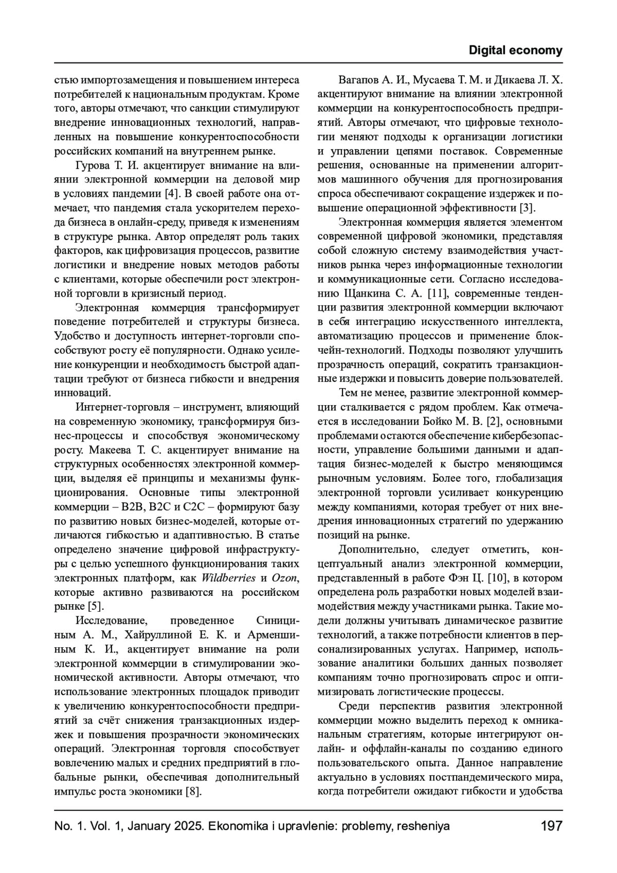 3. Вагапов А. И. Влияние электронной коммерции на конкурентоспособность предприятий / А. И. Вагапов, Т. М. Мусаева, Л. Х. Дикаева // Экономика и управление: проблемы, решения. - 2024. - Т. 8, № 6(147). - С. 44-49. EDN: EFGVHR