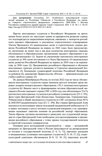 Приток иностранных студентов в Российскую Федерацию на протяжении более десяти лет выступает одним из приоритетов развития страны, что подтверждается закреплением вопросов, связанных с экспортом российского высшего образования, в документах стратегического планирования. Указом Президента