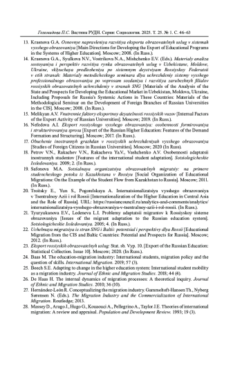 19. Сафонова М.А. Социальная организация образовательных миграций: на примере студенческого потока из Казахстана в Россию: Дисс. к.с.н. М., 2011. EDN: QFIMRB