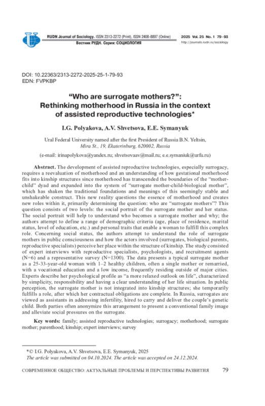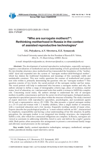 Развитие вспомогательных репродуктивных технологий, особенно суррогатного материнства, требует переосмысления материнства как феномена и понимания логики встраивания гестанционного материнства в структуры родства, поскольку материнство вышло за рамки диады «мать-ребенок» и расширилось до системы «суррогатная мать-ребенок-биологическая мать», что пошатнуло традиционные основы и смыслы, казалось бы, устойчивой и незыблемой конструкции родительства. Новые реалии формируют новые трактовки и новые роли материнства, ставя перед исследователями задачу описания тех, кто сегодня принимает решение стать суррогатной матерью, а именно - ее социального портрета и социального статуса. Социальный портрет помогает понять, кто становится суррогатной матерью и почему, - авторы перечисляют ряд демографических характеристик (возраст, место жительства, семейное положение, уровень образования и т. д.) и личностных черт, которые позволяют женщине выполнять эту сложную роль. Также авторы пытаются реконструировать общественное восприятие суррогатного материнства и то, как вовлеченные стороны (суррогатные матери, биологические родители, специалисты по репродукции) определяют позицию суррогатной матери в структуре родства. Проведенное авторами эмпирическое исследование позволило описать среднестатистическую суррогатную мать и ее статус в системе семейных отношений на основе сочетания методов экспертного интервью (с репродуктологами, репродуктивными психологами и агентами по рекрутингу, N=6) и репрезентативного опроса (N=1300). Согласно полученным данным, суррогатная мать в России - это, как правило, женщина 25-33 лет, имеющая 1-2 здоровых детей, часто одинокая мама или состоящая в повторном браке, со средним профессиональным образованием и невысоким доходом, проживающая в регионе. С психологической точки зрения эксперты отмечают ее «легкий взгляд на жизнь», простоту, ответственность и адекватное понимание ситуации. В общественном мнении суррогатная мать не включена в структуру родства, а выполняет временную функцию, после чего ее договорные обязательства считаются завершенными, т. е. суррогатная мать выполняет роль помощника в решении проблемы бесплодия (оказывает услуги по вынашиванию и рождению генетического ребенка пары), факт обращения к которому часто анонимизируется обеими сторонами для создания «нормального» образа семьи и снижения социального давления на суррогатную мать.