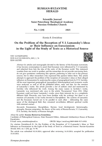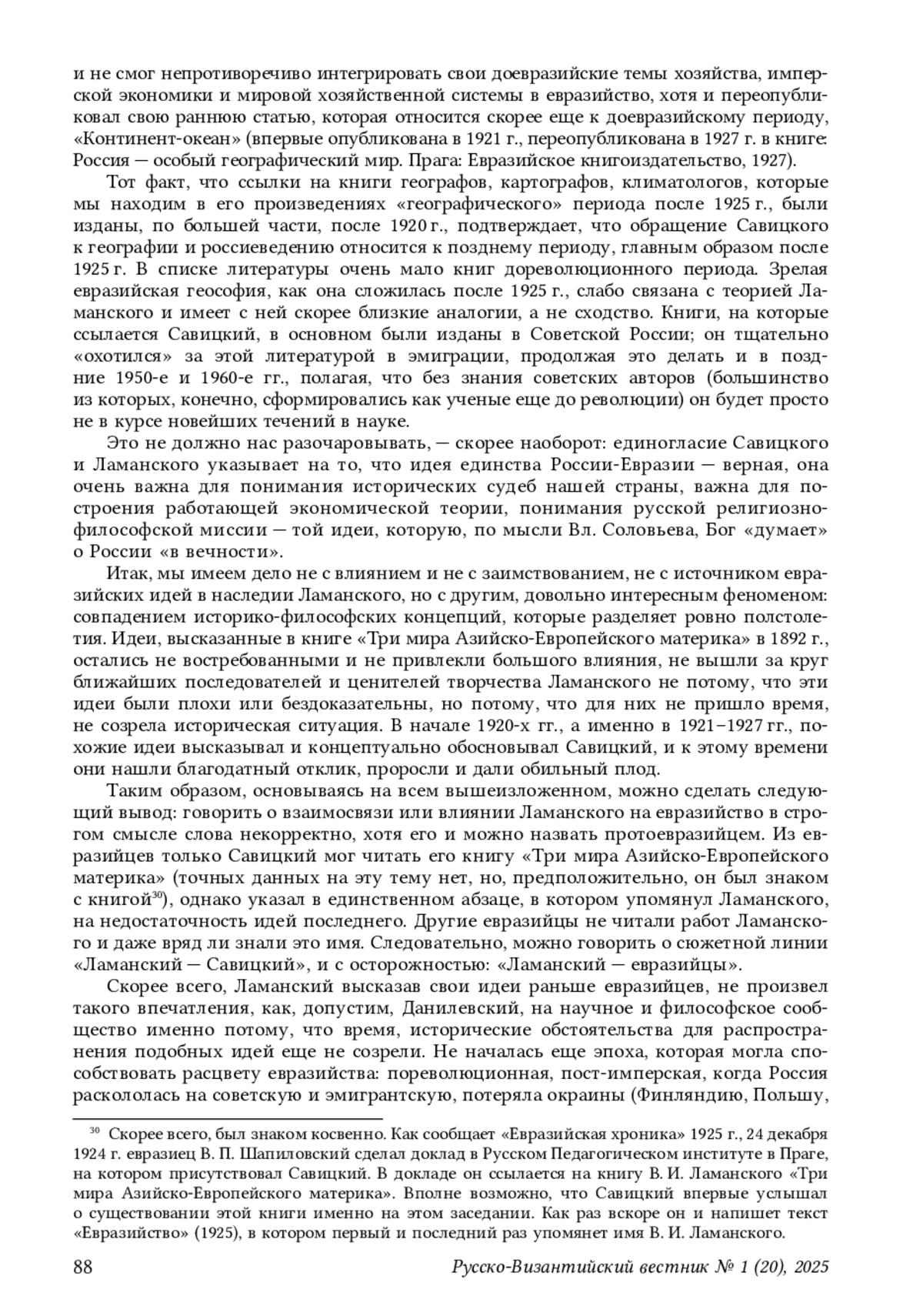 В статьях и монографиях, посвященных истории евразийского движения, стало общим местом утверждение о том, что евразийцы испытали влияние со стороны В. И. Ламанского и унаследовали от него идею единства евразийского мира. Это утверждение кочует из одной работы в другую, причем исследователи не приводят убедительных фактов, не дают цитат, подтверждающих это мнение, предпочитая ссылаться не на первоисточники, но на других исследователей. В настоящей статье предпринята попытка подойти к проблеме рецепции идей Ламанского или их предполагаемого влияния на евразийство путем анализа корпуса географических текстов П. Н. Савицкого. Были проанализированы все его важнейшие географические, геософские, историософские и экономические работы, а также все его опубликованные письма, ранние и поздние, на предмет упоминания трудов Ламанского. В статье приводится список цитируемых и упомянутых Савицким авторов, которые оказали влияние на его творчество. Среди множества имен в работах Савицкого Ламанский упомянут лишь однажды в статье «Евразийство» от 1925 г. Другие евразийцы не могли знать трудов Ламанского, поскольку их интересы лежали в совершенно иной области. Флоровский мог быть знаком с его текстами, но в его работах, посвященных славянофильству, нет упоминаний о Ламанском. Системы Ламанского и евразийцев оказались параллельны друг другу — очерчивая одно и то же пространство идейного поля, они остались все же разными духовными мирами с минимальным соприкосновением.
