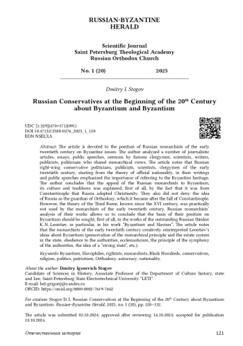 Статья посвящена позиции русских консерваторов начала ХХ в. по византийской проблематике. Автор проанализировал ряд публицистических статей, очерков, публичных речей, проповедей известных священнослужителей, ученых, писателей, публицистов, политиков, разделявших консервативные взгляды. Отмечается, что русские правоконсервативные политики, публицисты, ученые, священнослужители начала ХХ в., отталкиваясь от триады графа С. С. Уварова «Православие. Самодержавие. Народность», в трудах и публичных выступлениях подчеркивали важность обращения к византийскому наследию. Делается вывод о том, что обращение русских правых к Византии, ее культуре и традициям объяснялось в первую очередь тем, что именно из Константинополя Русь восприняла христианство. Не отрицалась ими и идея о России как хранительнице православия, которой она стала после падения Константинополя. Однако теория Третьего Рима, известная с XVI в., практически не использовалась. Анализ трудов русских консерваторов начала ХХ в. позволяет заключить, что основу их позиции по Византии следует искать главным образом в работах выдающегося русского мыслителя К. Н. Леонтьева, в особенности в его сочинении «Византизм и славянство». В статье отмечается, что консерваторы начала ХХ в. творчески переосмысляли идеи Леонтьева о византизме (сохранение в государстве монархического начала и сословного строя, послушание властям, церковность, принцип симфонии властей, идея «сильного государства» и т. д.).