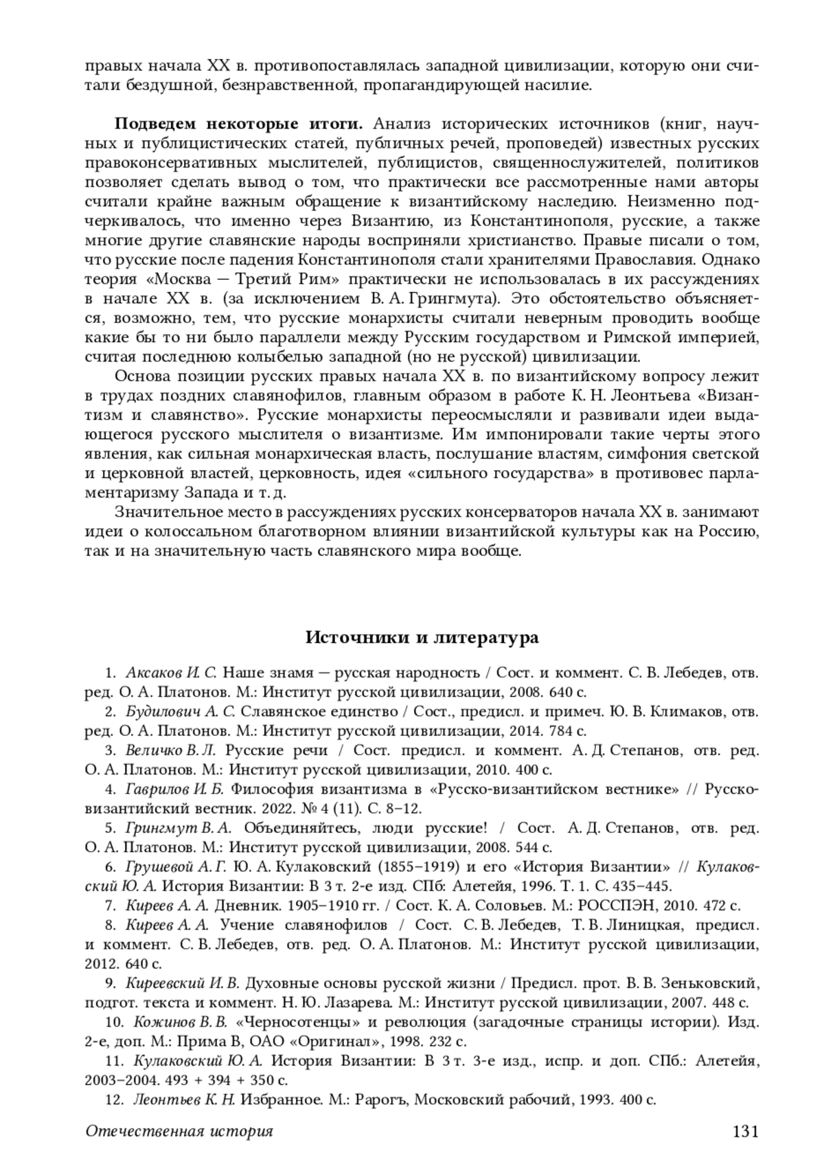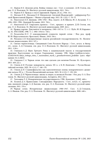 24. Стосов Д. И. Русские монархисты начала XX в. о К. Н. Леонтьеве // Русско-Византийский вестник. 2022. № 4 (11). С. 168-178. EDN: TAHKXX