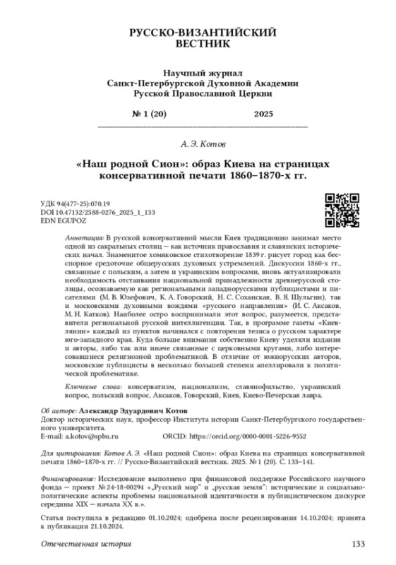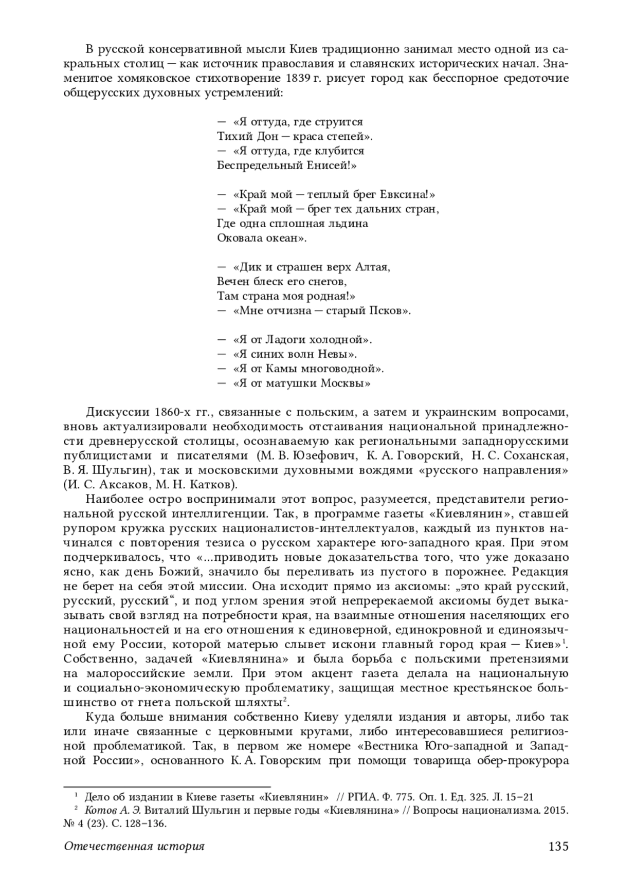 В русской консервативной мысли Киев традиционно занимал место одной из сакральных столиц — как источник православия и славянских исторических начал. Знаменитое хомяковское стихотворение 1839 г. рисует город как бесспорное средоточие общерусских духовных устремлений. Дискуссии 1860‑х гг., связанные с польским, а затем и украинским вопросами, вновь актуализировали необходимость отстаивания национальной принадлежности древнерусской столицы, осознаваемую как региональными западнорусскими публицистами и писателями (М. В. Юзефович, К. А. Говорский, Н. С. Соханская, В. Я. Шульгин), так и московскими духовными вождями «русского направления» (И. С. Аксаков, М. Н. Катков). Наиболее остро воспринимали этот вопрос, разумеется, представители региональной русской интеллигенции. Так, в программе газеты «Киевлянин» каждый из пунктов начинался с повторения тезиса о русском характере юго-западного края. Куда больше внимания собственно Киеву уделяли издания и авторы, либо так или иначе связанные с церковными кругами, либо интересовавшиеся религиозной проблематикой. В отличие от южнорусских авторов, московские публицисты в несколько большей степени апеллировали к политической проблематике.