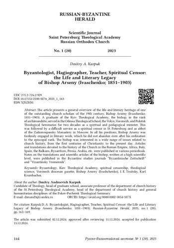 Имя епископа Арсения (Иващенко) на рубеже XIX–XX вв. было хорошо известно всем, кто занимался историей Византии, особенно поздним ее периодом, тогда еще не очень хорошо изученным. Знаток нескольких языков1, ученый и переводчик, он ежегодно публиковал на страницах периодической печати чрезвычайно ценные исследования и переводы, за которыми пристально следили и в Германии. К сожалению, после кончины этого выдающегося ученого архиерея серьезного и обстоятельного изучения его научного наследия не последовало. Исключение составляют только работы заведующего библиотекой Санкт-Петербургской духовной академии Алексея Степановича Родосского2 и профессора по кафедре церковной истории Московской духовной академии Алексея Анатольевича Спасского3. Работы первого носят общий характер и скорее намечают пути дальнейших исследований. Статья Спасского — довольно объемная и фундаментальная, но в ней сам автор признается, что рассматривает только некоторые работы епископа Арсения.