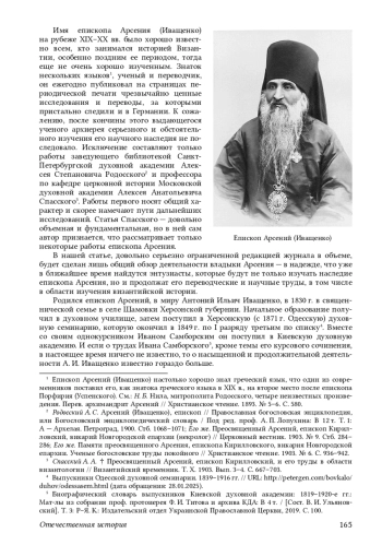 В статье представлен общий обзор жизненного пути и литературного наследия одного из выдающихся церковных ученых XIX столетия — епископа Арсения (Иващенко; 1831–1903). Будучи выпускником Киевской духовной академии, владыка в сане архимандрита в течение двух десятилетий нес духовно-педагогическое служение в Одесском духовном училище, Волынской, Воронежской и Полоцкой духовных семинариях. Далее была сложная служба на посту духовного цензора в Санкт-Петербурге и настоятельство в Заиконосспаском монастыре в Москве. На всех занимаемых должностях епископ Арсений неустанно занимался литературными трудами, которые он не оставил и после рукоположения в епископский сан. Владыку интересовал широкий спектр вопросов, касающихся церковной истории, начиная с первых веков христианства и вплоть до настоящего ему времени. В различных периодических изданиях были опубликованы статьи и переводы, посвященные истории Церкви в Римской империи, Африке, Италии, Испании, на Балканах, в Византии, Персии, Аравии и др. Заметки о переводах и научных статьях владыки, написанных на высоком научном уровне, публиковались в византиноведческих журналах «Byzantinische Zeitschrift» и «Византийский временник».