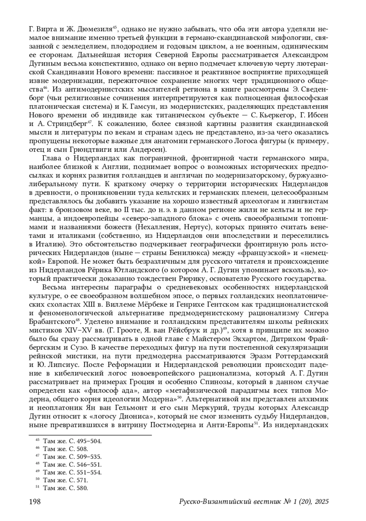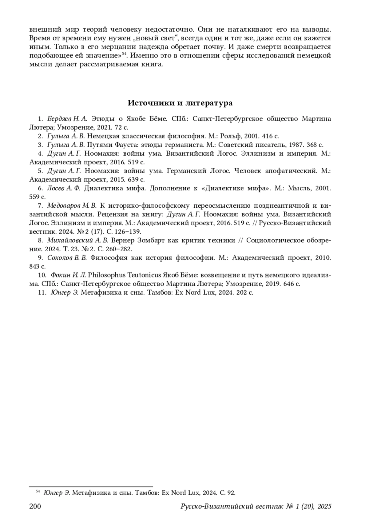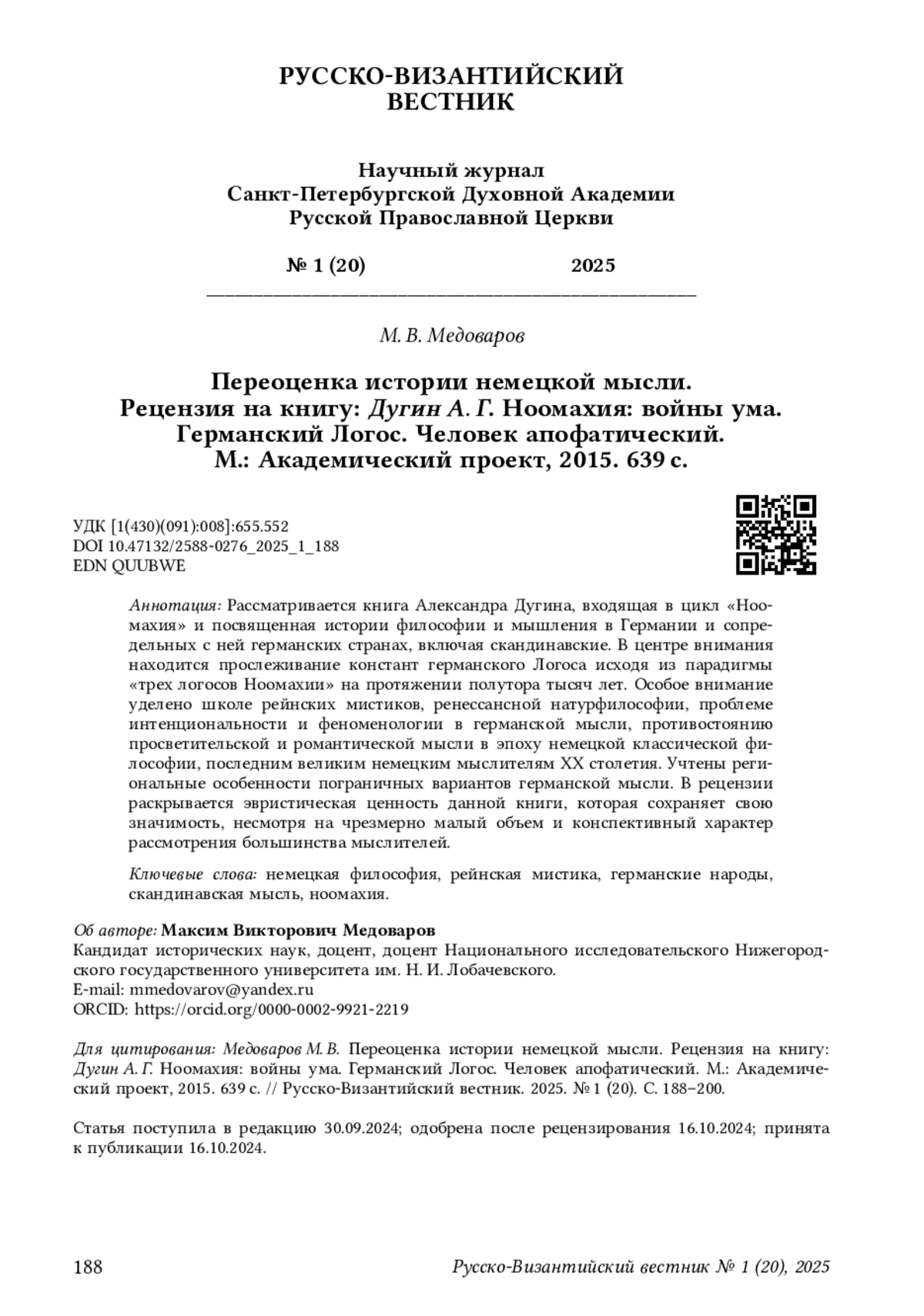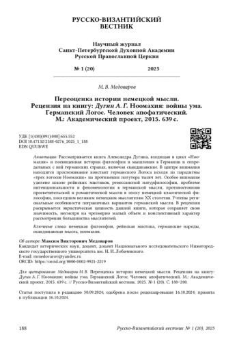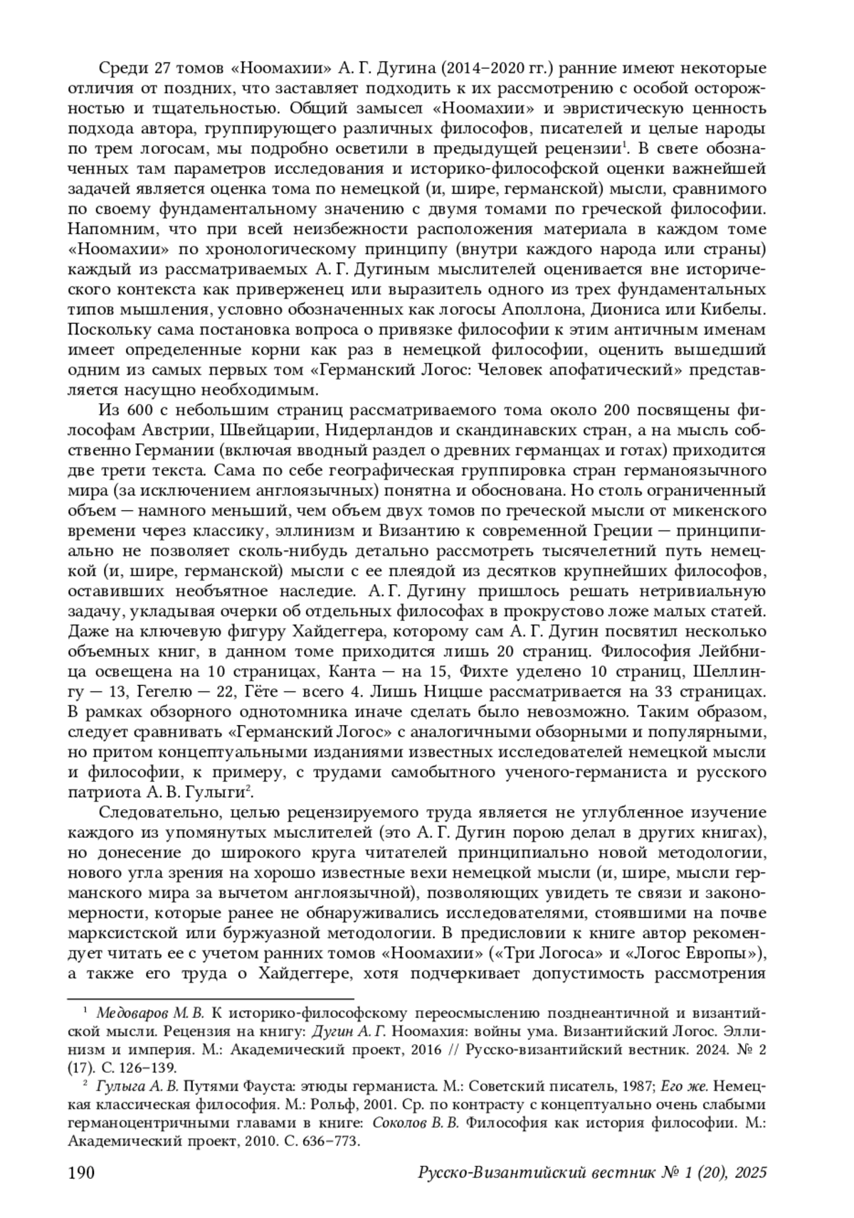МЕДОВАРОВ М. В. ПЕРЕОЦЕНКА ИСТОРИИ НЕМЕЦКОЙ МЫСЛИ. РЕЦЕНЗИЯ НА КНИГУ: ДУГИН А. Г. НООМАХИЯ: ВОЙНЫ УМА. ГЕРМАНСКИЙ ЛОГОС. ЧЕЛОВЕК АПОФАТИЧЕСКИЙ. М.: АКАДЕМИЧЕСКИЙ ПРОЕКТ, 2015. 639 С. // РУССКО-ВИЗАНТИЙСКИЙ ВЕСТНИК. 2025. № 1 (20)