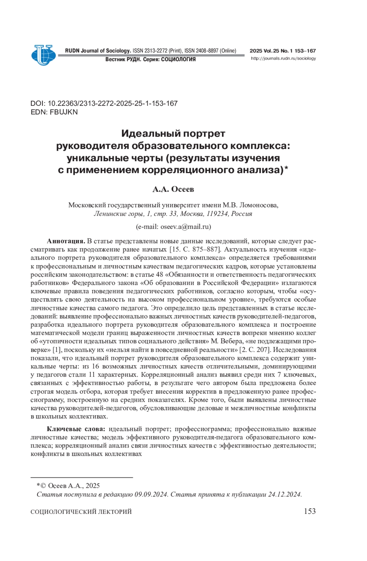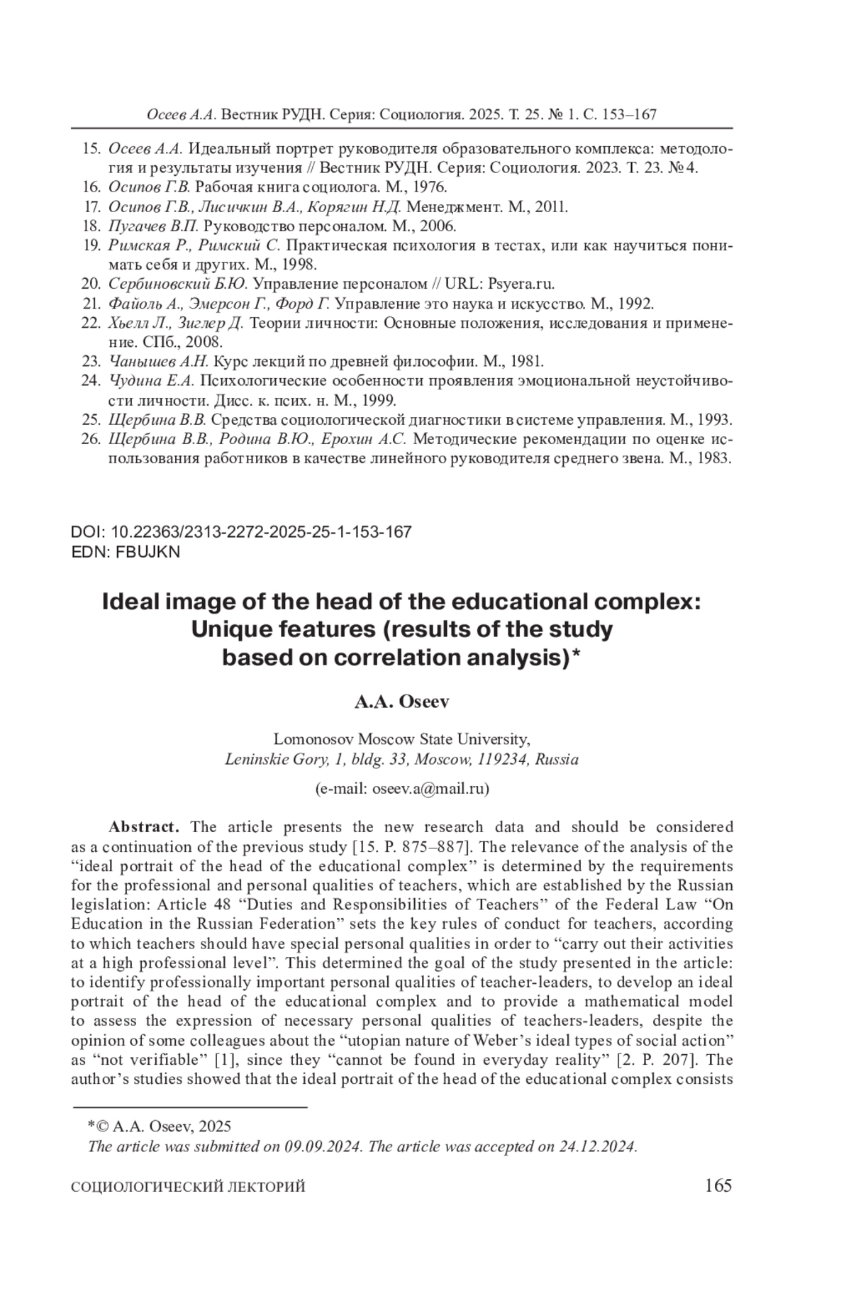 15. Осеев А.А. Идеальный портрет руководителя образовательного комплекса: методология и результаты изучения // Вестник РУДН. Серия: Социология. 2023. Т. 23. № 4.