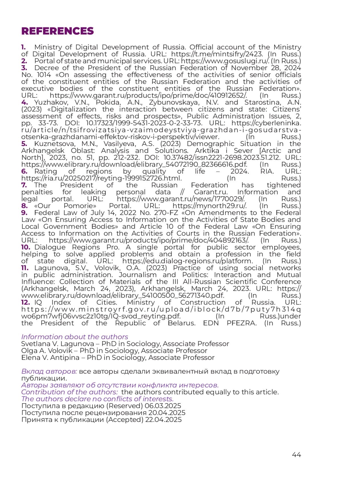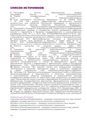 23. Lagunova, S.V., Volovik, O.A. (2023) Practice of using social networks in public administration. Journalism and Politics: Interaction and Mutual Influence: Collection of Materials of the III All-Russian Scientific Conference (Arkhangelsk, March 24, 2023), Arkhangelsk, March 24, 2023. URL: download/elibrary_54100500_56271340.pdf.(In Russ.). EDN: MVPKIC