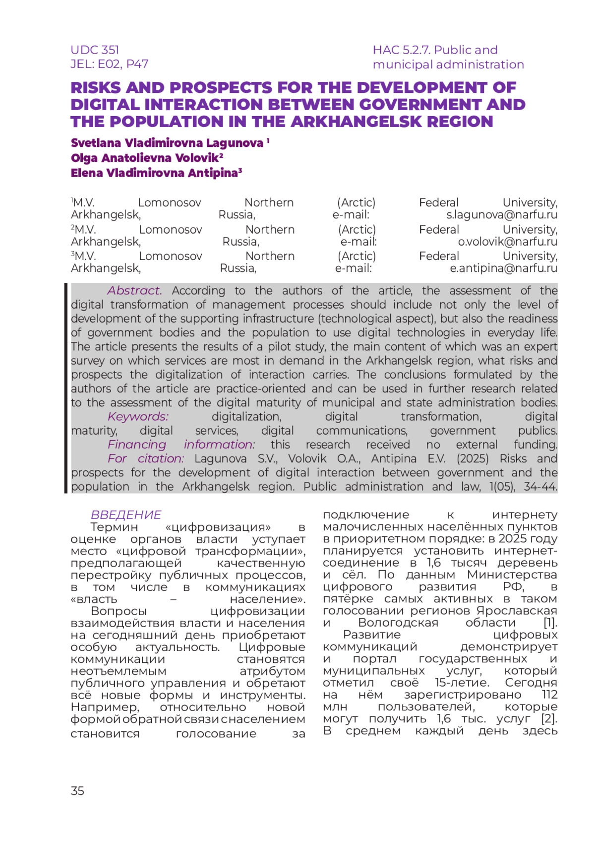 По мнению авторов статьи, оценка цифровой трансформации управленческих процессов должна включать не только уровень развития обеспечивающей инфраструктуры (технологический аспект), но и готовность органов власти и населения использовать цифровые технологии в повседневной жизни. В статье представлены результаты пилотажного исследования, основным содержанием которого был экспертный опрос о том, какие сервисы наиболее востребованы в Архангельской области, какие риски и перспективы несёт в себе цифровизация взаимодействия. Сформулированные авторами статьи выводы носят практико-ориентированный характер и могут быть использованы в дальнейших исследованиях, связанных с оценкой цифровой зрелости органов муниципального и государственного управления.