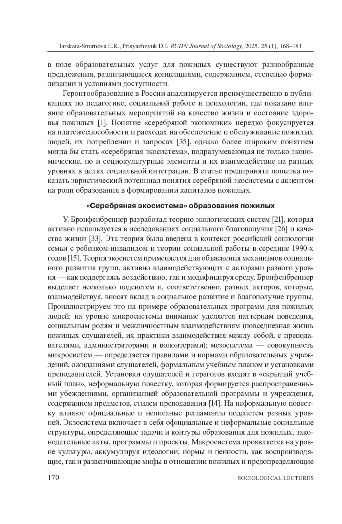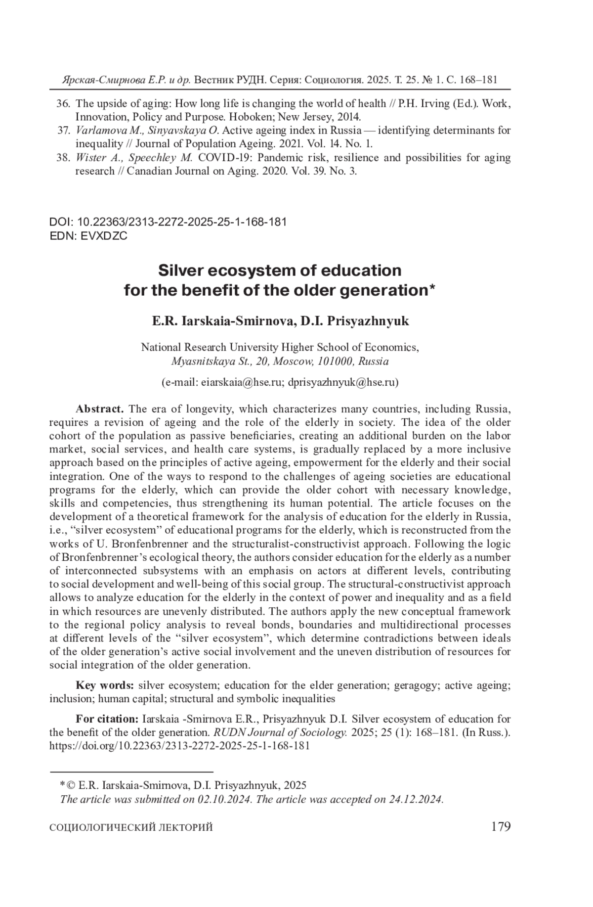 34. Prisiazhniuk D., Holavins A. Active ageing and social services: The paradox of empowerment in Russia // Europe-Asia Studies. 2023. Vol. 75. No. 2. EDN: SNZGBC