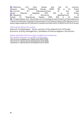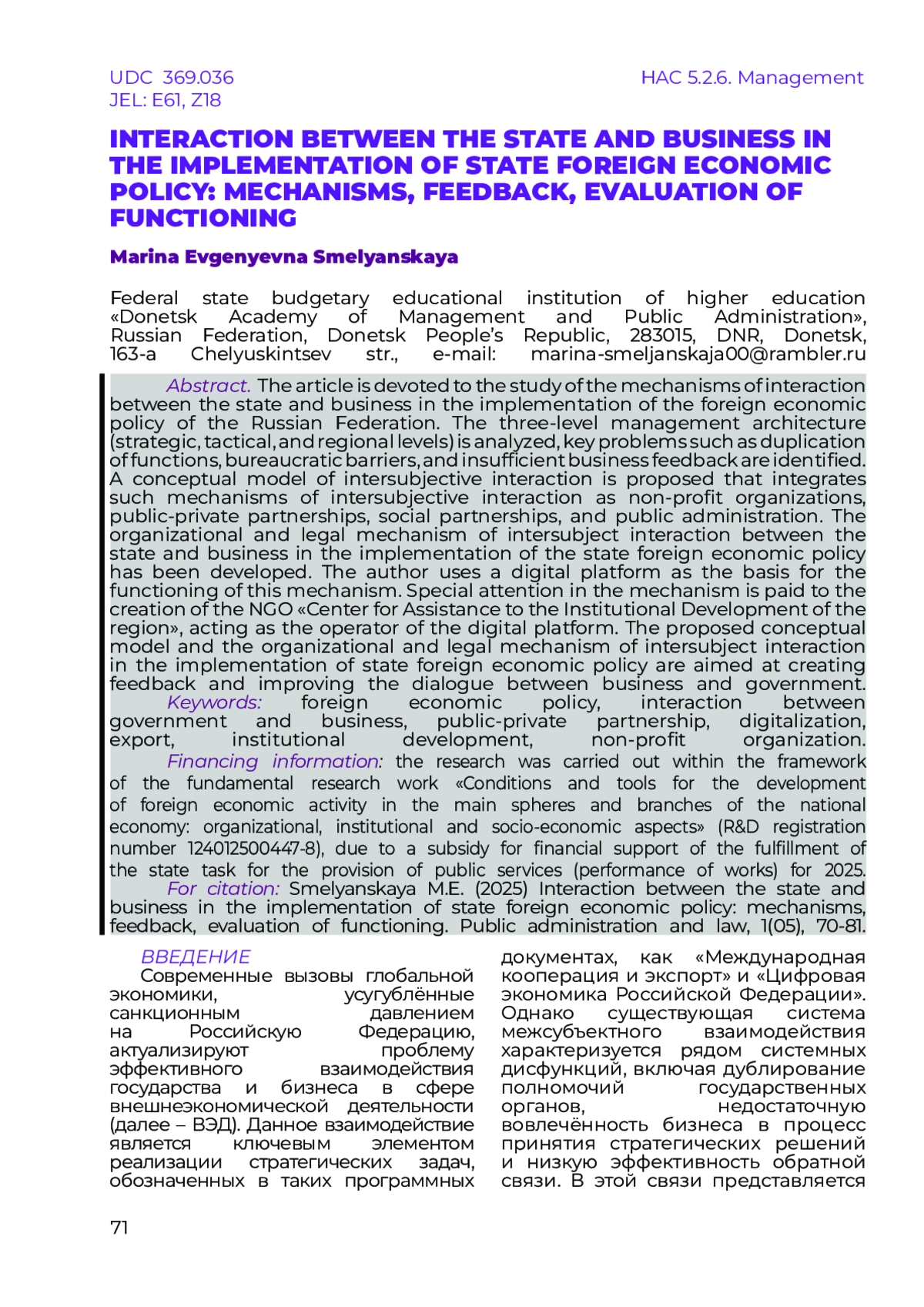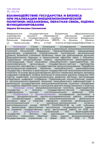 СМЕЛЯНСКАЯ М. Е. ВЗАИМОДЕЙСТВИЕ ГОСУДАРСТВА И БИЗНЕСА ПРИ РЕАЛИЗАЦИИ ВНЕШНЕЭКОНОМИЧЕСКОЙ ПОЛИТИКИ: МЕХАНИЗМЫ, ОБРАТНАЯ СВЯЗЬ, ОЦЕНКА ФУНКЦИОНИРОВАНИЯ // НАУЧНЫЙ ЖУРНАЛ "ГОСУДАРСТВЕННОЕ УПРАВЛЕНИЕ И ПРАВО". 2025. № 1 (5)