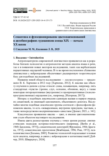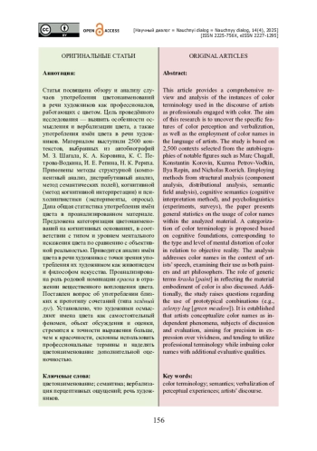 Статья посвящена обзору и анализу случаев употребления цветонаименований в речи художников как профессионалов, работающих с цветом. Цель проведённого исследования — выявить особенности осмысления и вербализации цвета, а также употребления имён цвета в речи художников. Материалом выступили 2500 контекстов, выбранных из автобиографий М. З. Шагала, К. А. Коровина, К. С. Петрова-Водкина, И. Е. Репина, Н. К. Рериха. Применены методы структурной (компонентный анализ, дистрибутивный анализ, метод семантических полей), когнитивной (метод когнитивной интерпретации) и психолингвистики (эксперименты, опросы). Дана общая статистика употребления имён цвета в проанализированном материале. Предложена категоризация цветонаименований на когнитивных основаниях, в соответствии с типом и уровнем ментального искажения цвета по сравнению с объективной реальностью. Приводится анализ имён цвета в речи художника с точки зрения употребления их художником как живописцем и философом искусства. Проанализирована роль родовой номинации краска в отражении вещественного воплощения цвета. Поставлен вопрос об употреблении близких к прототипу сочетаний (типа зелёный луг). Установлено, что художники осмысляют имена цвета как самостоятельный феномен, объект обсуждения и оценки, стремятся к точности выражения больше, чем к красочности, склонны использовать профессиональные термины и наделять цветонаименование дополнительной оценочностью.