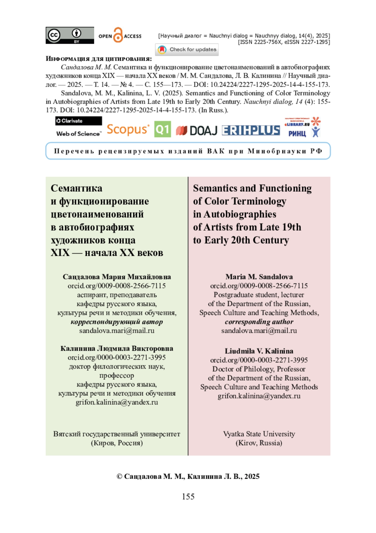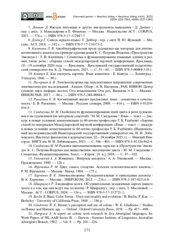 13. Сандалова М. М. Особенности функционирования имён цвета в речи художников и не-художников (на материале соцсетей) / М. М. Сандалова // Язык - текст - дискурс в новых условиях коммуникации (к 60-летию профессора Т. Б. Радбиля): сборник статей по материалам Международной научной конференции «Язык - текст - дискурс в новых условиях коммуникации (к 60-летию профессора Т. Б. Радбиля)» (Национальный исследовательский Нижегородский государственный университет им. Н. И. Лобачевского, Институт филологии и журналистики, 22-24 ноября 2023 г.). - Нижний Новгород : ННГУ им. Н. И. Лобачевского, 2023. - С. 396-403. - ISBN 978-5-91326-862-4.