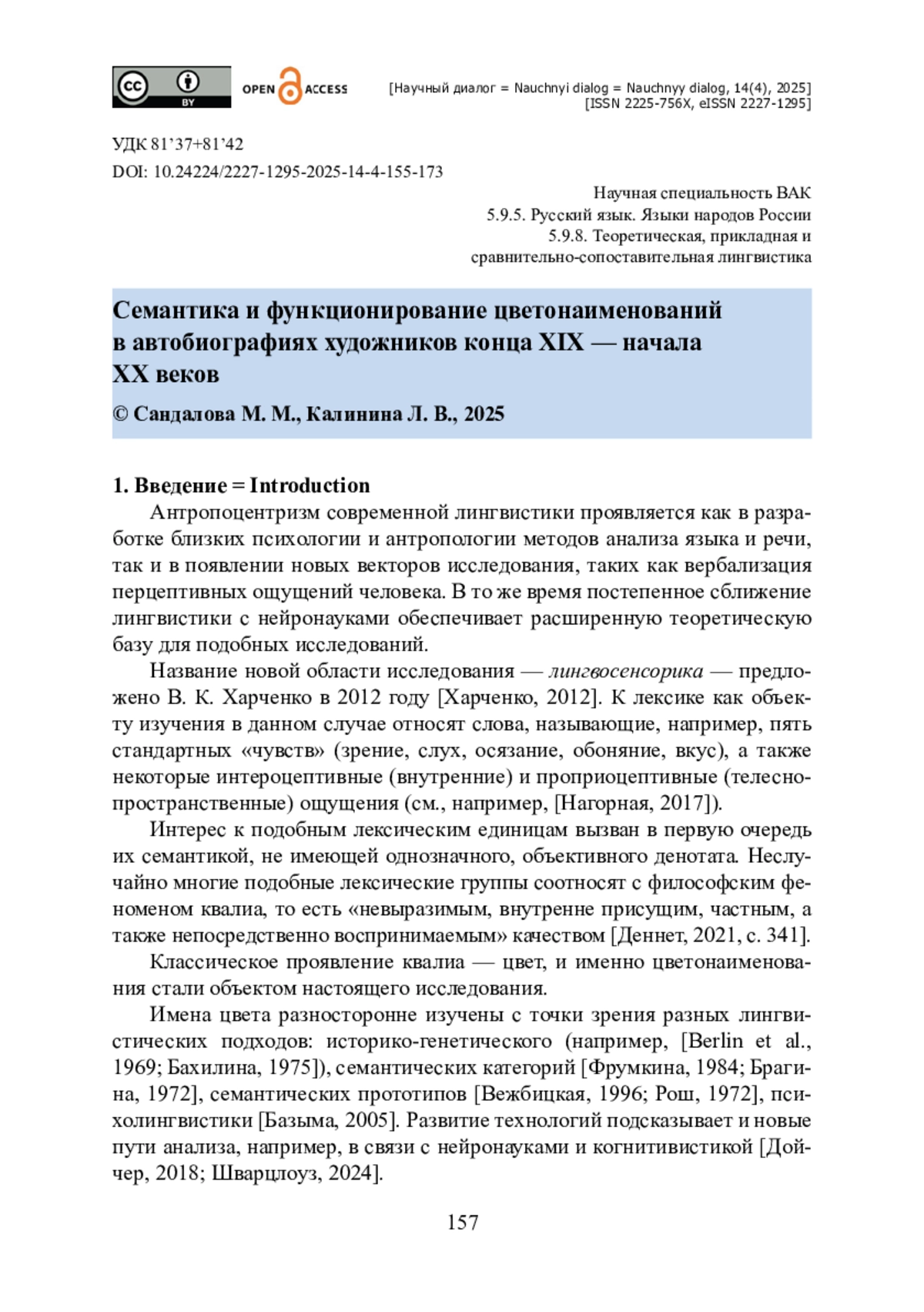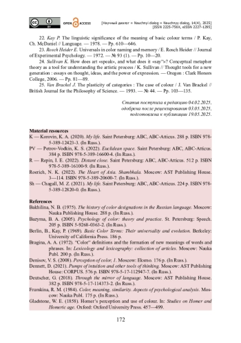 14. Сандалова М. М. Родовое цветонаименование «краска» в «Пространстве Эвклида» К. С. Петрова-Водкина как вещественное воплощение цвета / М. М. Сандалова // Семантика. Функционирование. Текст. - Киров : [б. и.], 2024. - С. 97-102.