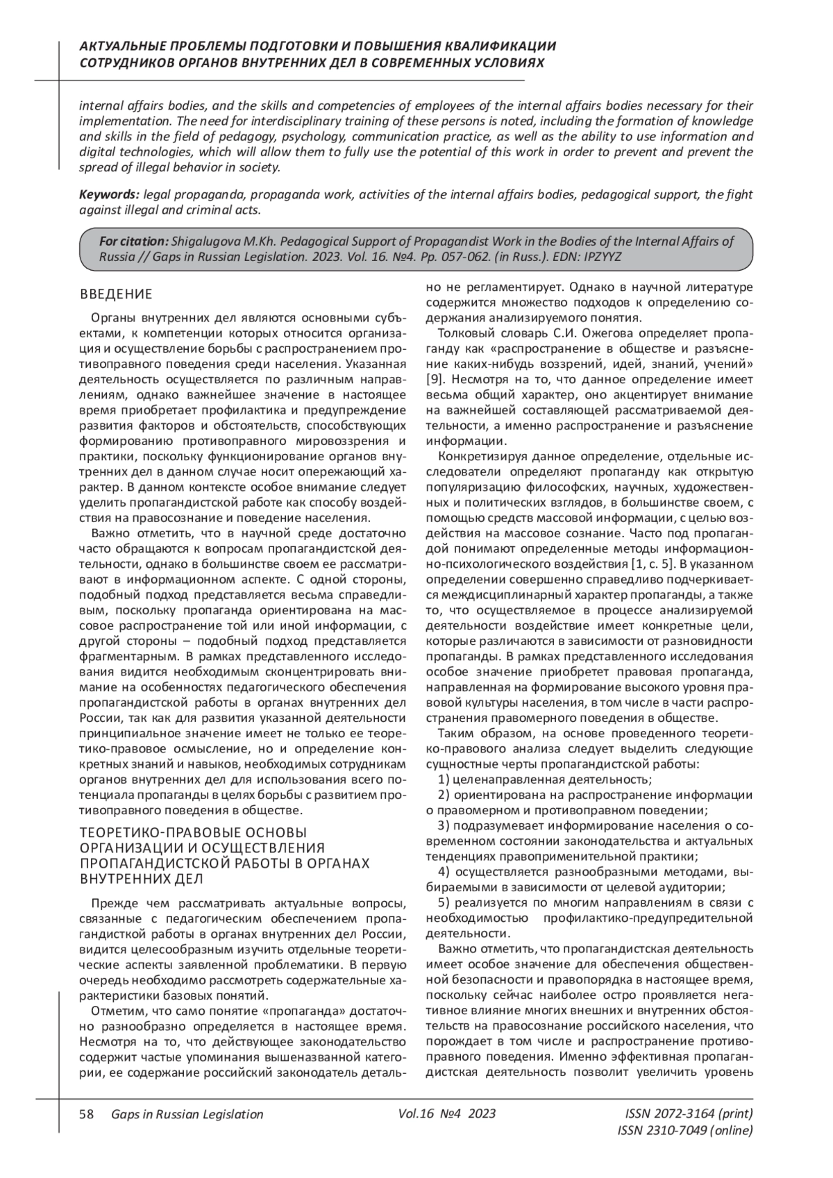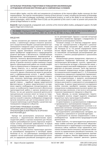 Борьба с распространением противоправного поведения в обществе выступает одним из основных направлений деятельности органов внутренних дел. Указанная деятельность предполагает профилактико-предупредительную работу, основным элементом которой выступает пропаганда. Пропагандистская деятельность ориентирована на распространение определенной информации в целях воздействия на правосознание населения, повышения его уровня и минимизации негативного влияния конкретных противоправных идей и взглядов. В данном контексте особое значение приобретает развитие необходимых знаний, умений, навыков и компетенций сотрудников органов внутренних дел для эффективного осуществления вышеназванной деятельности. Целью представленного исследования выступает анализ особенностей педагогического обеспечения пропагандистской работы в органах внутренних дел России. Автор приходит к выводу о том, что в настоящее время пропагандистская деятельность имеет особое практическое значение для обеспечения общественной безопасности и правопорядка, поскольку сейчас наиболее остро проявляется негативное влияние многих внешних и внутренних обстоятельств на правосознание российского населения, что порождает в том числе и распространение противоправного поведения. Акцентируется внимание на актуальных направлениях пропагандистской работы, осуществляемой органами внутренних дел, и необходимых для их реализации умений, навыков и компетенций сотрудников органов внутренних дел. Отмечается необходимость междисциплинарной подготовки указанных лиц, в том числе формирование знаний и навыков в сфере педагогики, психологии, коммуникативной практики, а также умений применения информационных и цифровых технологий, что позволит им в полной мере использовать потенциал указанной работы в целях профилактики и предупреждения распространения противоправного поведения в обществе.