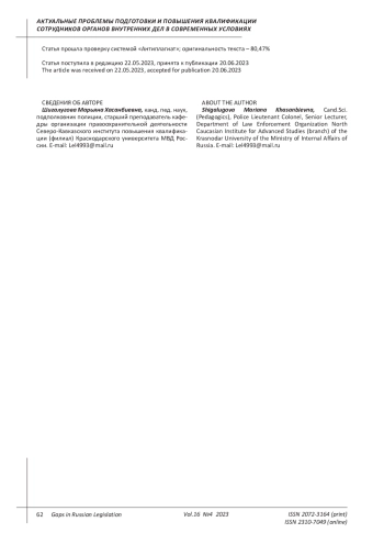 Magomedov M.N. Pedagogical conditions for the formation of the readiness of students of educational organizations of the Ministry of Internal Affairs to confront propaganda and recruitment activities // Gaps in Russian legislation. 2020. V. 13. No. 4. P. 181-184. EDN: DJOTOK