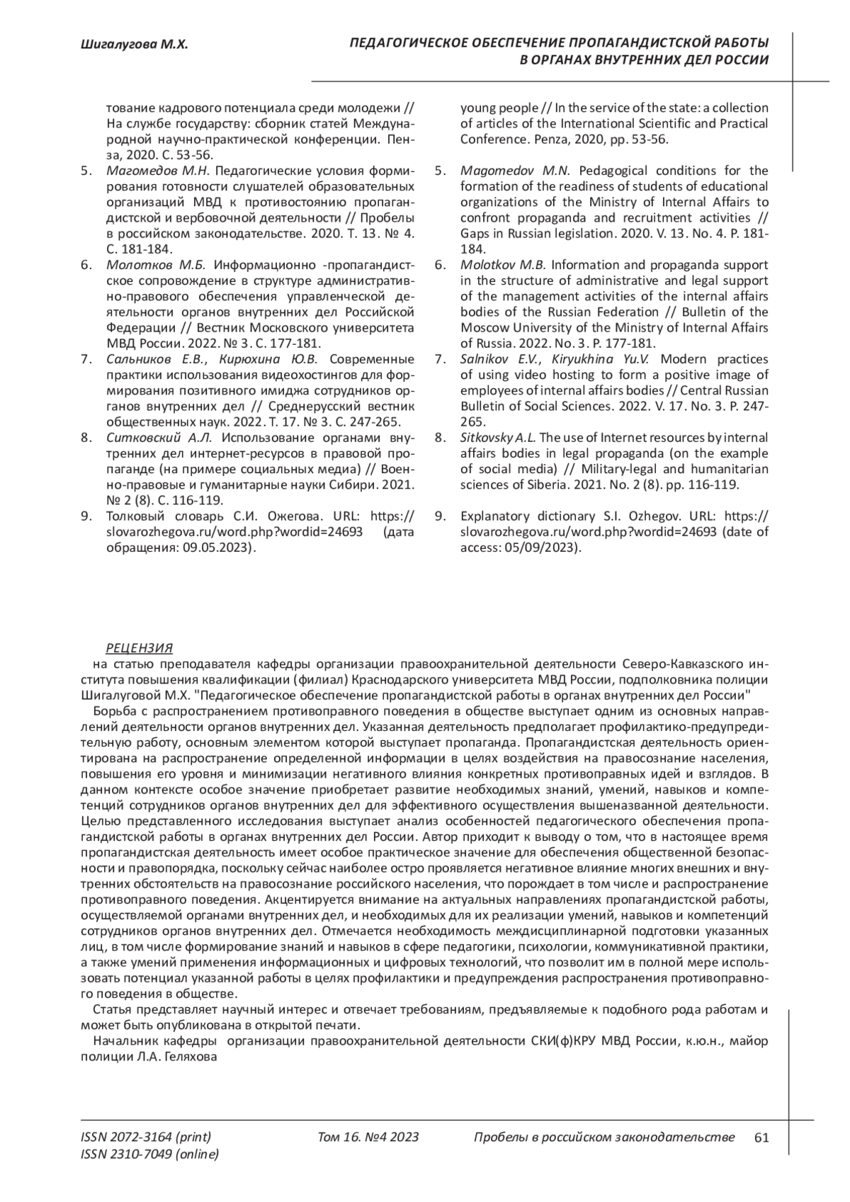 5. Магомедов М.Н. Педагогические условия формирования готовности слушателей образовательных организаций МВД к противостоянию пропагандистской и вербовочной деятельности // Пробелы в российском законодательстве. 2020. Т. 13. № 4. С. 181-184. EDN: DJOTOK