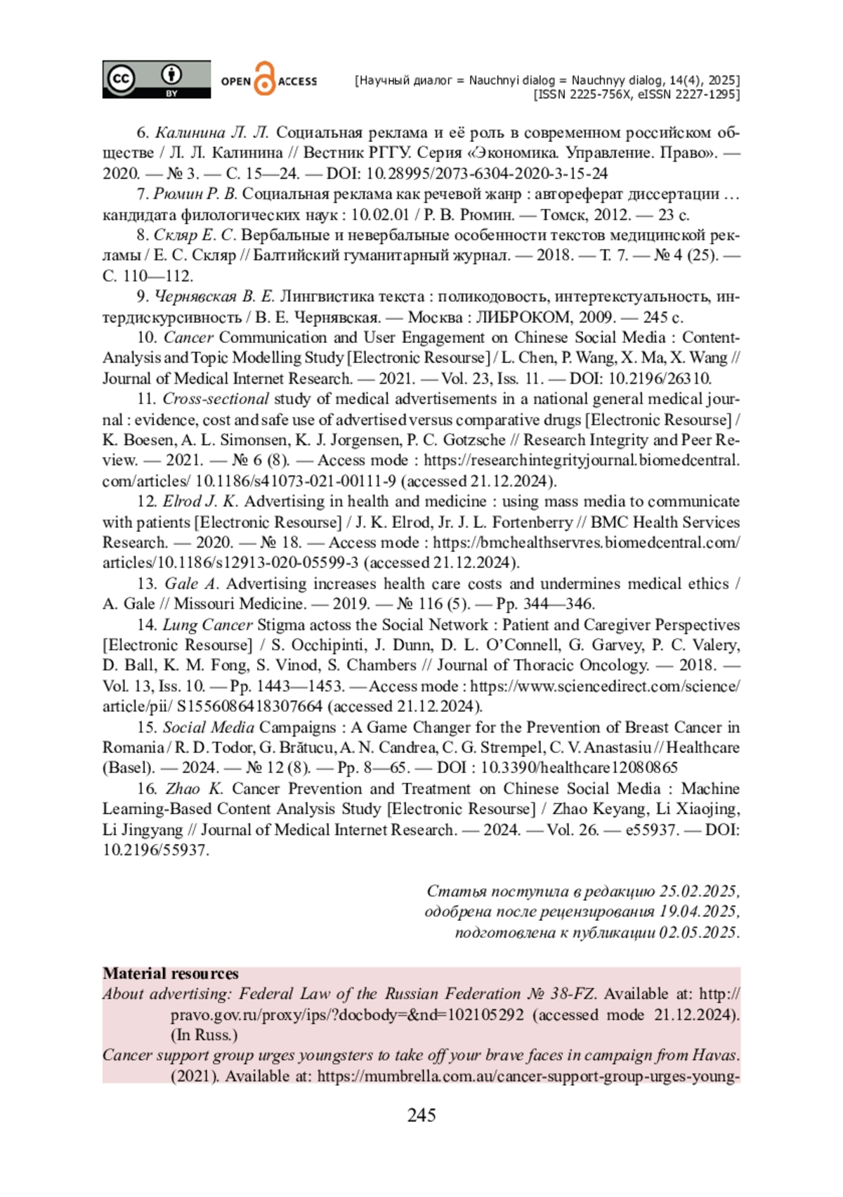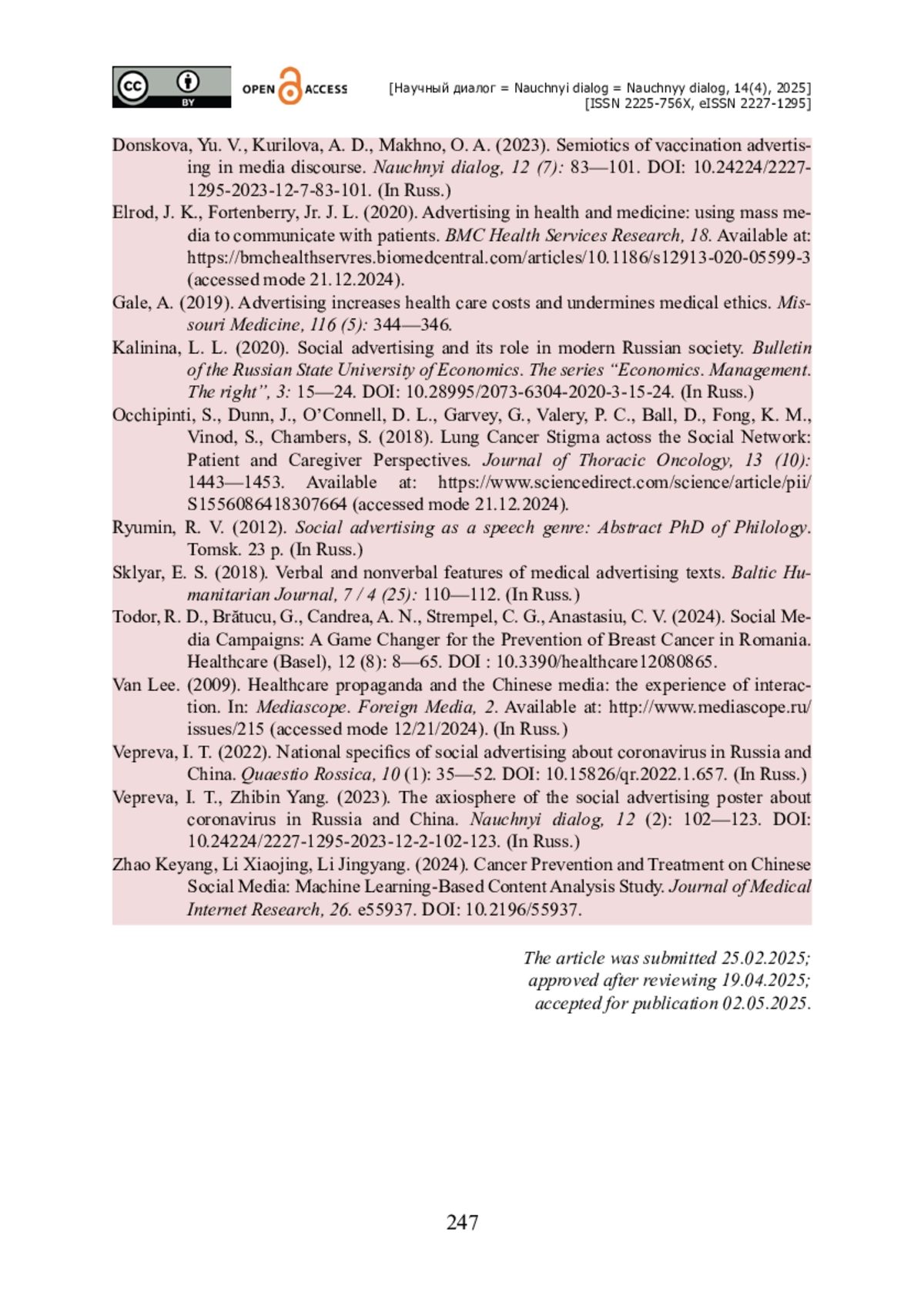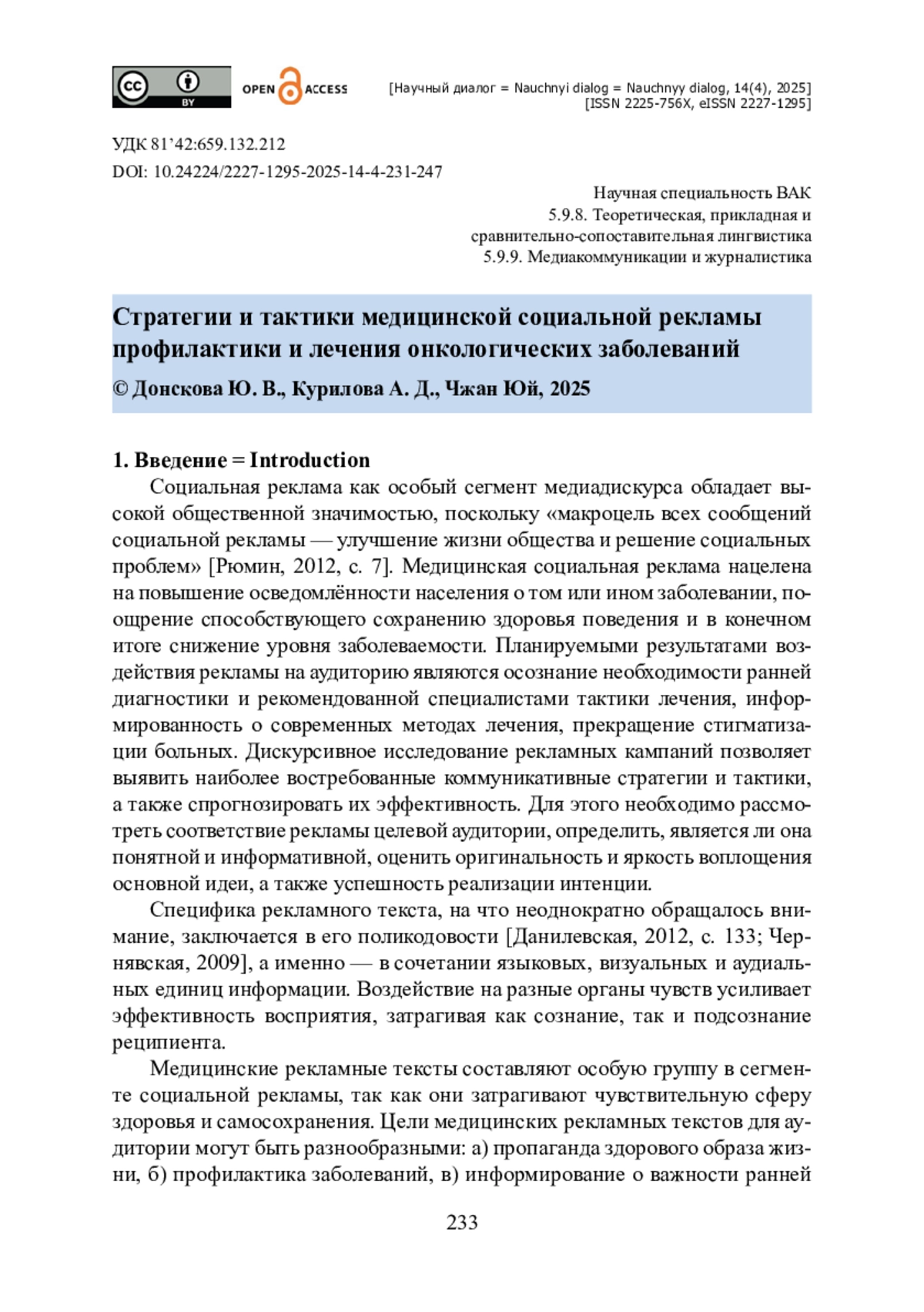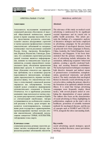 ДОНСКОВА Ю. В., КУРИЛОВА А. Д., ЧЖАН Ю. СТРАТЕГИИ И ТАКТИКИ МЕДИЦИНСКОЙ СОЦИАЛЬНОЙ РЕКЛАМЫ ПРОФИЛАКТИКИ И ЛЕЧЕНИЯ ОНКОЛОГИЧЕСКИХ ЗАБОЛЕВАНИЙ // НАУЧНЫЙ ДИАЛОГ. 2025. ТОМ 14, № 4