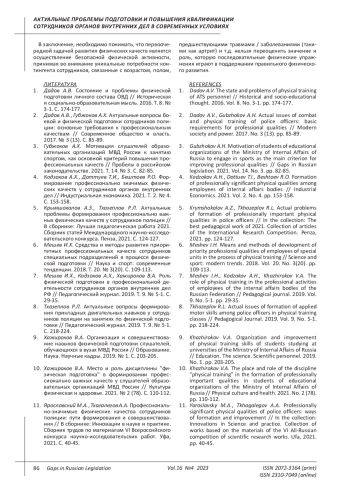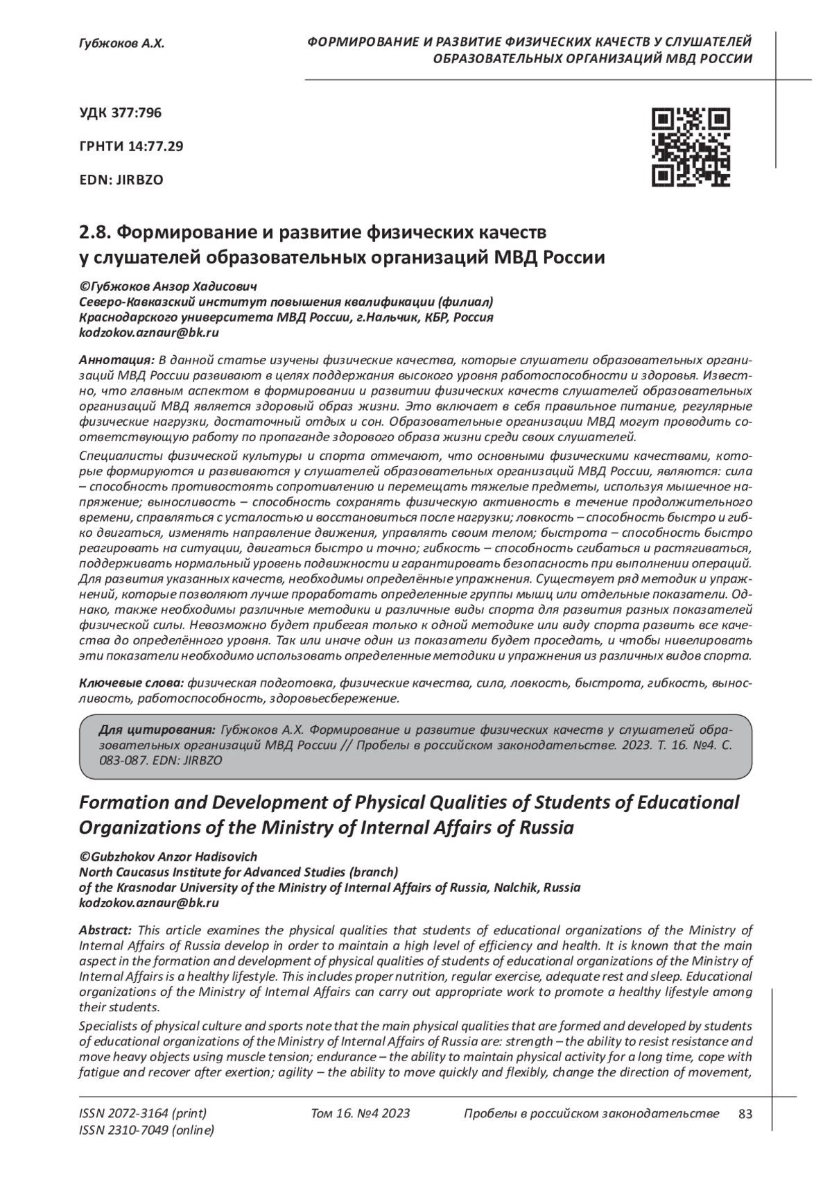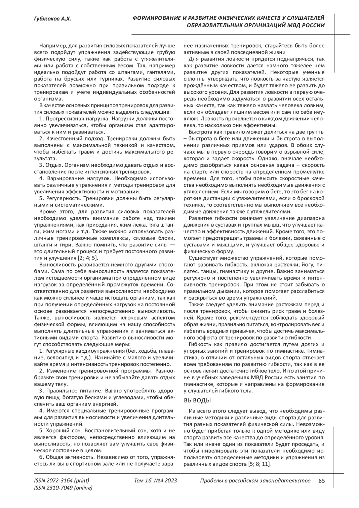 ГУБЖОКОВ А. Х. ФОРМИРОВАНИЕ И РАЗВИТИЕ ФИЗИЧЕСКИХ КАЧЕСТВ У СЛУШАТЕЛЕЙ ОБРАЗОВАТЕЛЬНЫХ ОРГАНИЗАЦИЙ МВД РОССИИ // ПРОБЕЛЫ В РОССИЙСКОМ ЗАКОНОДАТЕЛЬСТВЕ. 2023. Т. 16 № 4