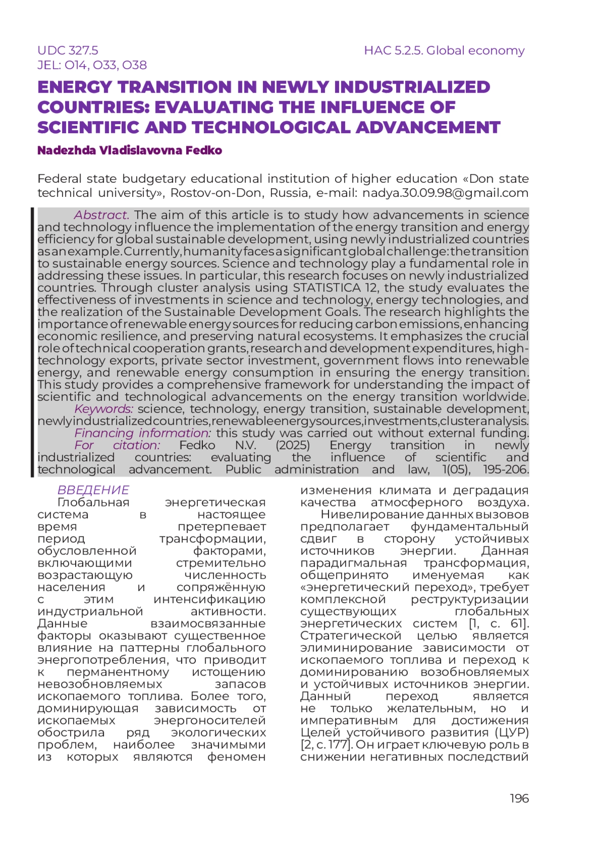 ФЕДЬКО Н. В. ЭНЕРГЕТИЧЕСКИЙ ПЕРЕХОД В НОВЫХ ИНДУСТРИАЛЬНЫХ СТРАНАХ: ОЦЕНКА ВЛИЯНИЯ НАУЧНО-ТЕХНИЧЕСКОГО РАЗВИТИЯ // НАУЧНЫЙ ЖУРНАЛ "ГОСУДАРСТВЕННОЕ УПРАВЛЕНИЕ И ПРАВО". 2025. № 1 (5)
