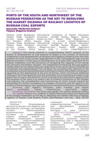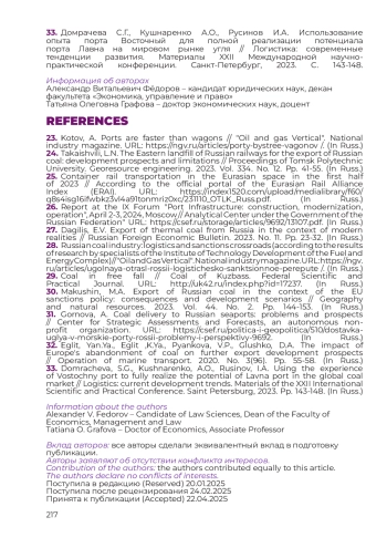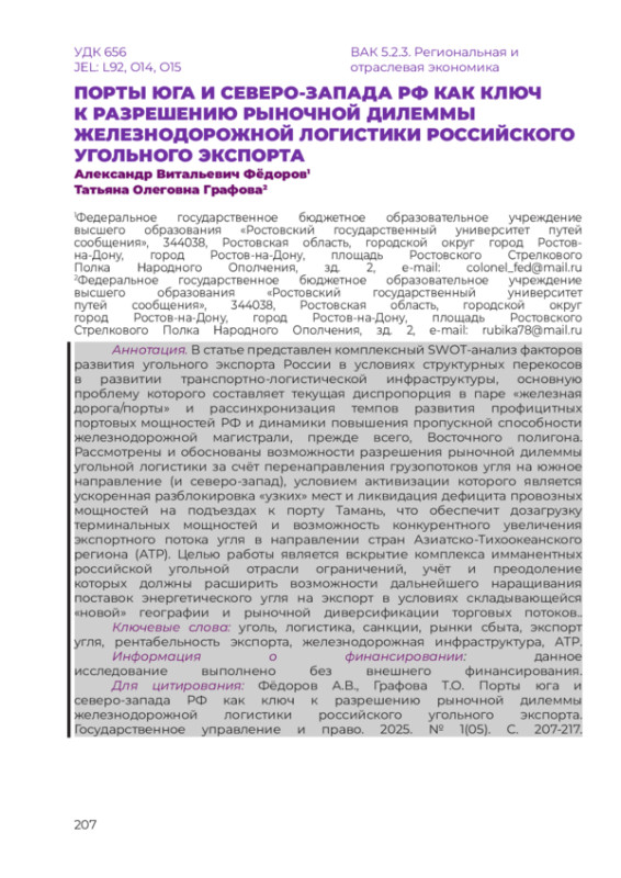 ФЁДОРОВ А. В., ГРАФОВА Т. О. ПОРТЫ ЮГА И СЕВЕРО-ЗАПАДА РФ КАК КЛЮЧ К РАЗРЕШЕНИЮ РЫНОЧНОЙ ДИЛЕММЫ ЖЕЛЕЗНОДОРОЖНОЙ ЛОГИСТИКИ РОССИЙСКОГО УГОЛЬНОГО ЭКСПОРТА // НАУЧНЫЙ ЖУРНАЛ "ГОСУДАРСТВЕННОЕ УПРАВЛЕНИЕ И ПРАВО". 2025. № 1 (5)