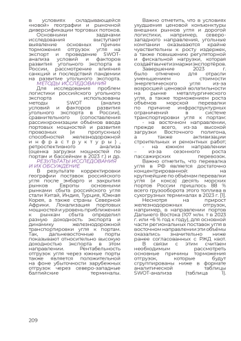 В статье представлен комплексный SWOT-анализ факторов развития угольного экспорта России в условиях структурных перекосов в развитии транспортно-логистической инфраструктуры, основную проблему которого составляет текущая диспропорция в паре «железная дорога/порты» и рассинхронизация темпов развития профицитных портовых мощностей РФ и динамики повышения пропускной способности железнодорожной магистрали, прежде всего, Восточного полигона. Рассмотрены и обоснованы возможности разрешения рыночной дилеммы угольной логистики за счёт перенаправления грузопотоков угля на южное направление (и северо-запад), условием активизации которого является ускоренная разблокировка «узких» мест и ликвидация дефицита провозных мощностей на подъездах к порту Тамань, что обеспечит дозагрузку терминальных мощностей и возможность конкурентного увеличения экспортного потока угля в направлении стран Азиатско-Тихоокеанского региона (АТР). Целью работы является вскрытие комплекса имманентных российской угольной отрасли ограничений, учёт и преодоление которых должны расширить возможности дальнейшего наращивания поставок энергетического угля на экспорт в условиях складывающейся «новой» географии и рыночной диверсификации торговых потоков..
