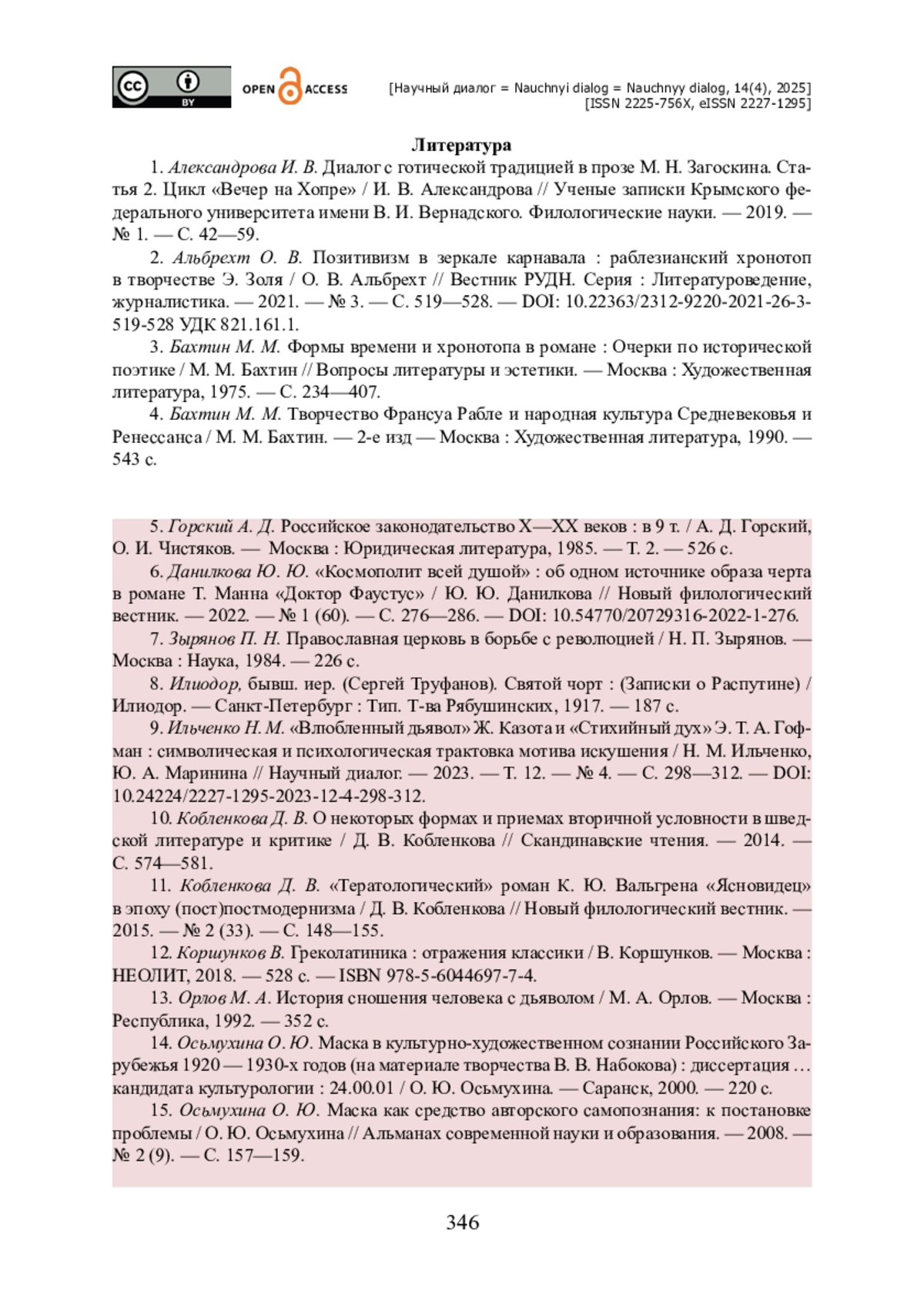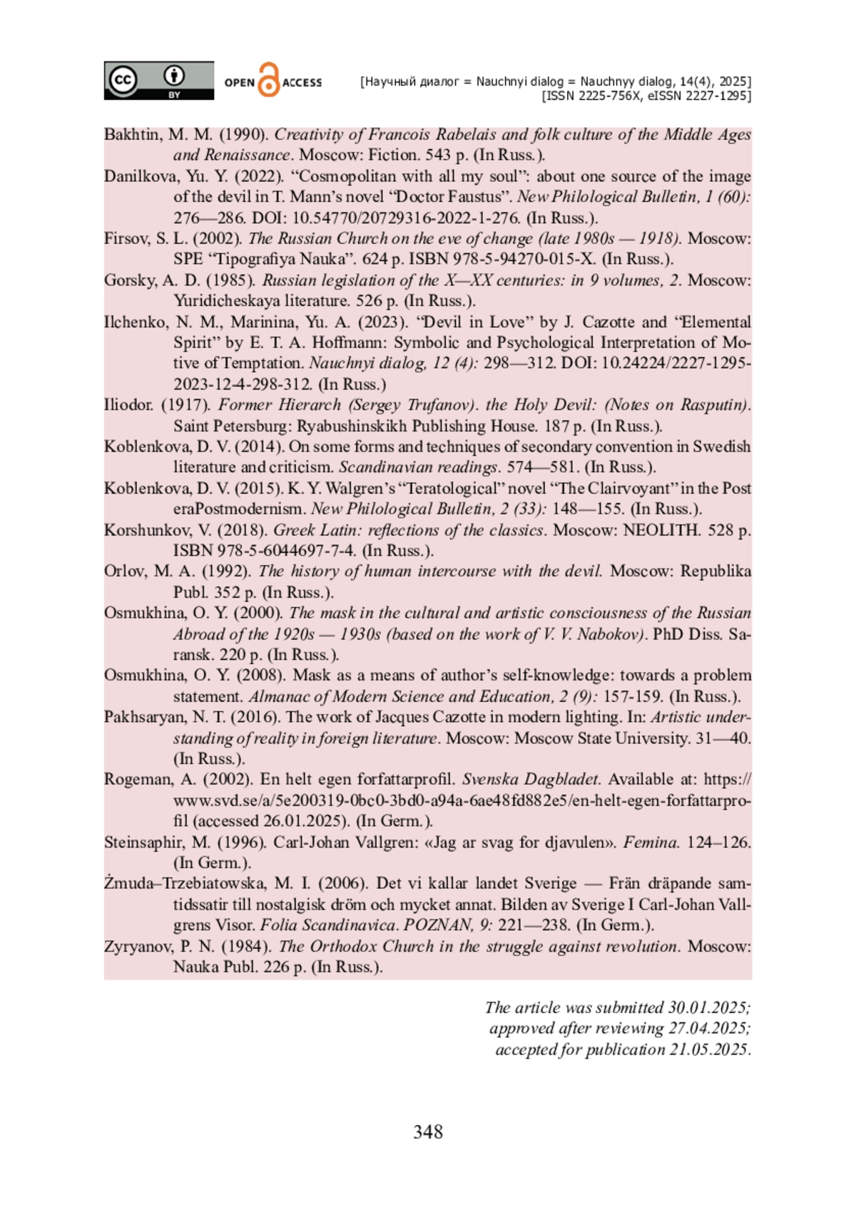 6. Данилкова Ю. Ю. «Космополит всей душой» : об одном источнике образа черта в романе Т. Манна «Доктор Фаустус» / Ю. Ю. Данилкова // Новый филологический вестник. - 2022. - № 1 (60). - С. 276-286. - https://doi.org/10.54770/20729316-2022-1-276.