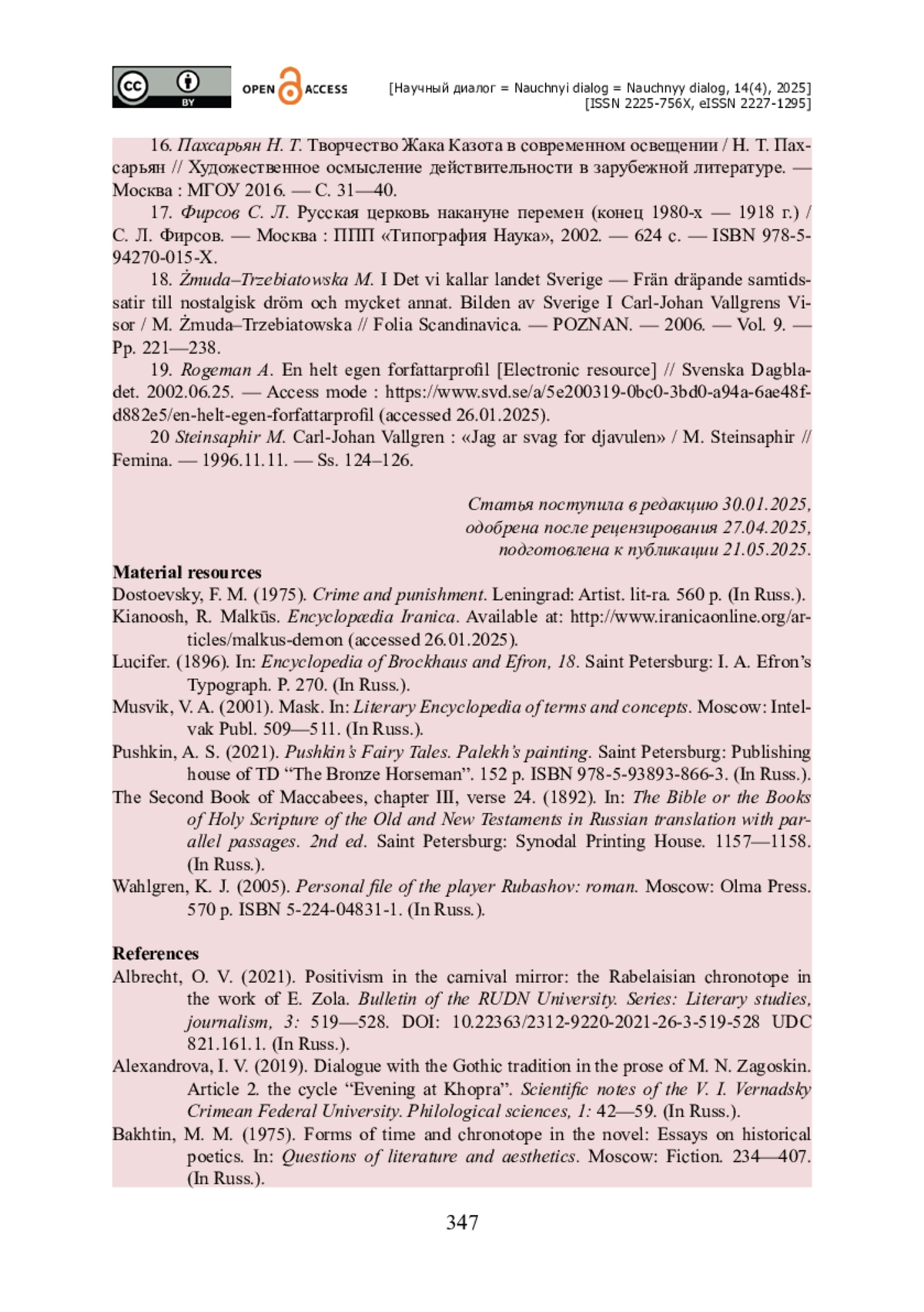 19. Rogeman A. En helt egen forfattarprofil [Electronic resource] // Svenska Dagbladet. 2002.06.25. - Access mode : https://www.svd.se/a/5e200319-0bc0-3bd0-a94a-6ae48fd882e5/en-helt-egen-forfattarprofil (accessed 26.01.2025).